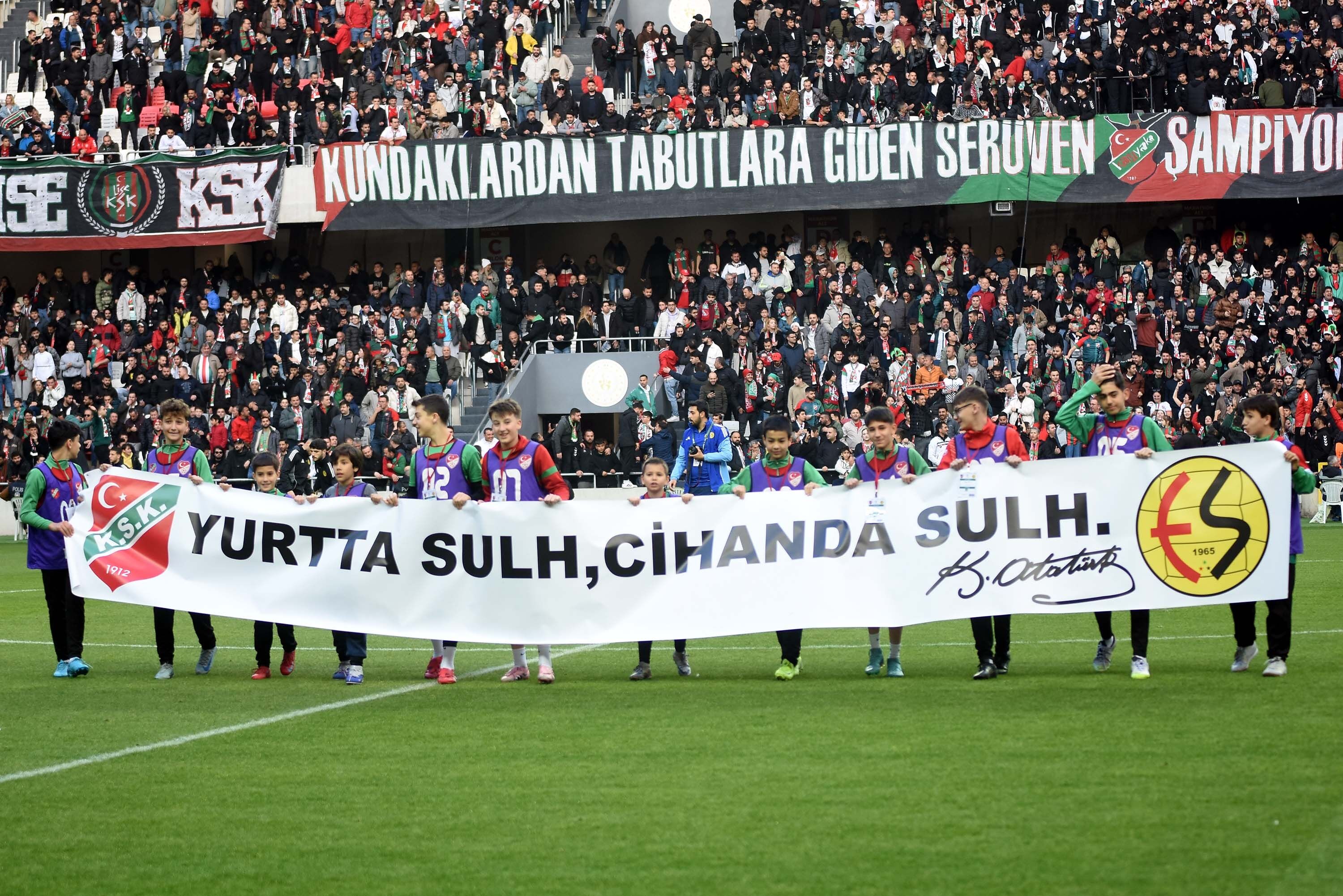 Taraftarlar maç öncesinde Atatürk’ün “Yurtta sulh, cihanda sulh” pankartı ve beyaz güvercinlerle barışı simgeledi. Karşıyaka taraftarları “Savaşlar olmasın, çocuklar ölmesin” diye tezahürat yaptı, iki takım tribünleri birlik mesajı verdi.