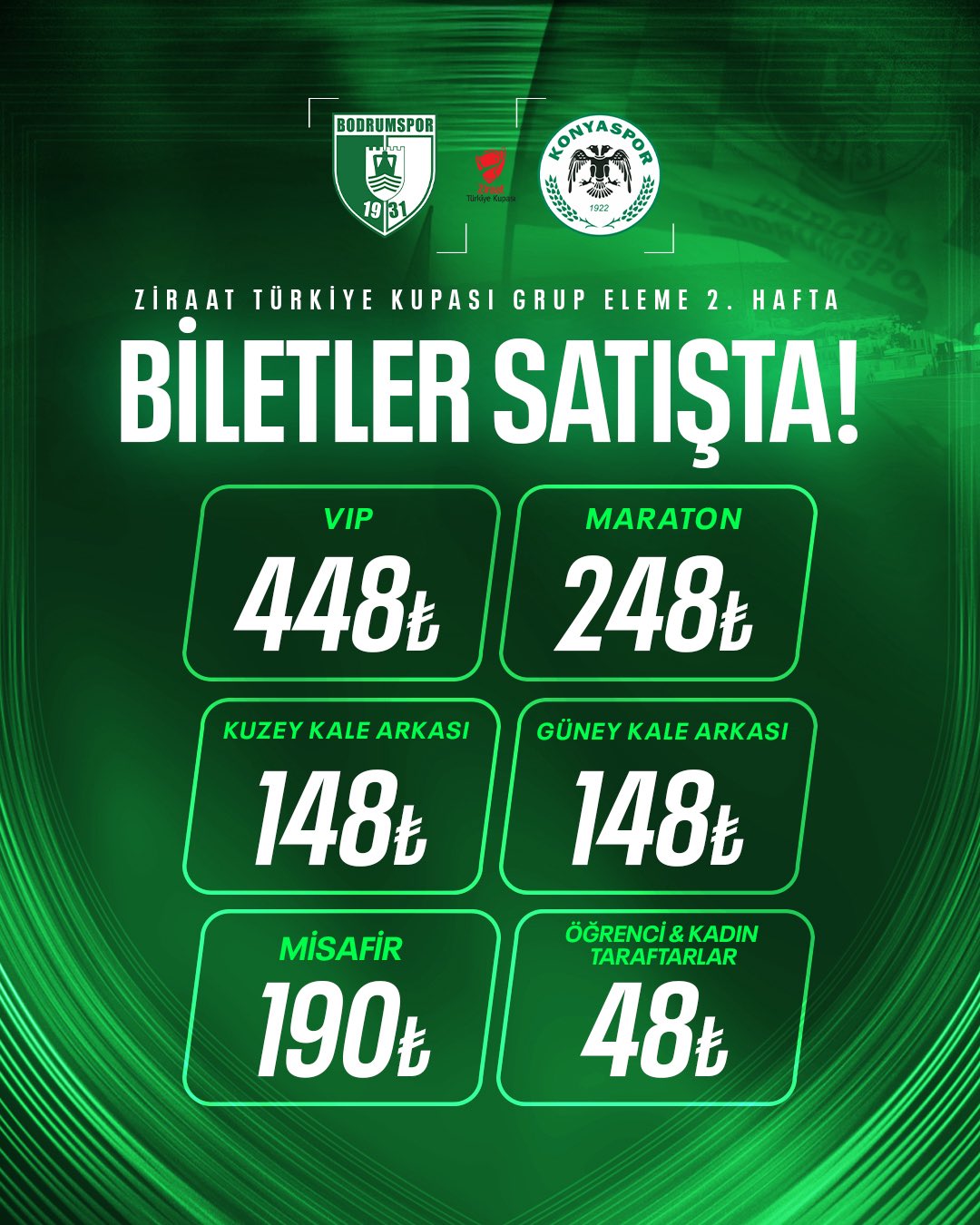 Tümosan Konyaspor, Ziraat Türkiye Kupası Grup Aşaması B Grubu 2. haftasında 15 Ocak Perşembe günü deplasmanda Sipay Bodrum FK ile karşılaşacak. Bodrum İlçe Stadyumu’nda oynanacak maç saat 18.00’de başlayacak. Karşılaşmanın biletleri satışa çıktı. Konuyla ilgili Bodrumspor Kulübü’nden yapılan açıklamada, “Ziraat Türkiye Kupası 2. Haftasında, sahamızda Tümosan Konyaspor’u ağırlayacağımız karşılaşmanın biletleri satışa sunulmuştur. Maç biletlerini Passo Mobil Uygulaması ve passo.com.tr üzerinden temin edebilirsiniz”. denildi.