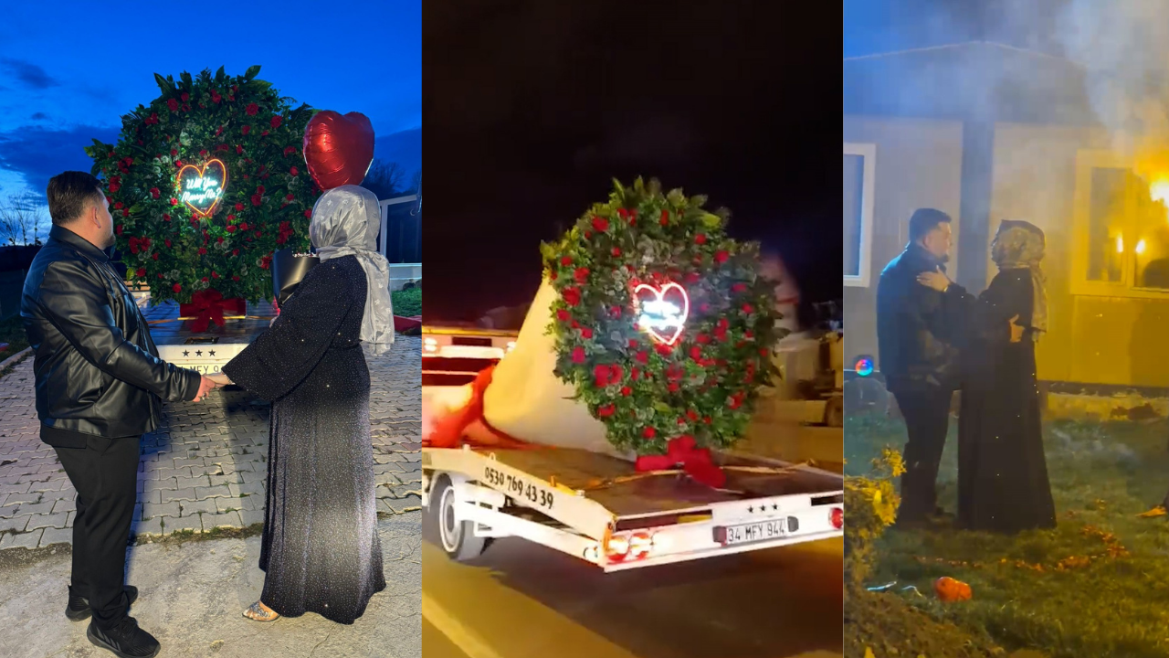 İş makinesini adeta hareketli bir sevgi seline dönüştüren Tolga Efe, çekicisiyle birlikte kız arkadaşı Emine Rana'nın karşısına çıktı. Devasa çiçekleri ve hayat arkadaşını bir anda karşısında gören genç kadın, bu eşine az rastlanır yaratıcı organizasyon karşısında şaşkınlığını ve sevincini gizleyemedi.