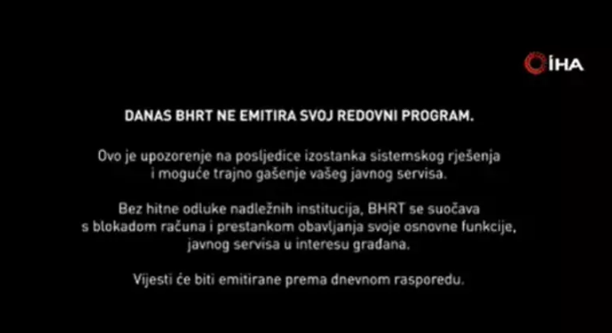"Bu teknik bir arıza değildir. Bu BHRT'nin kapatılması ihtimaline ilişkin bir uyarıdır. Bosna Hersek Radyo ve Televizyonu, finansmanına sistemsel bir çözüm bulunmaması halinde faaliyetlerine son verebilir. BHRT, bugün olağan yayın akışını gerçekleştirmiyor. Günlük bazda yaşanan hesap blokajları ve Avrupa Yayın Birliği'nin (EBU) yakında süresi dolacak milyonlarca euroluk blokajı, BHRT'nin sonunun yaklaştığını açıkça gösteriyor