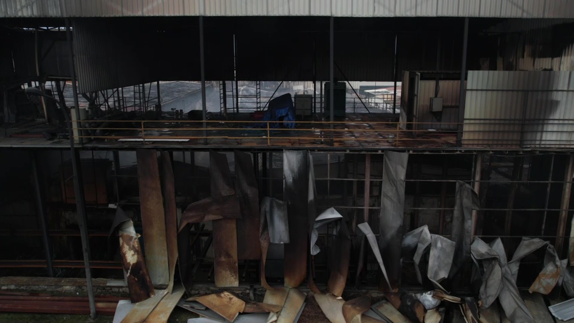 Dron ile havadan kaydedilen görüntülerde, fabrikanın büyük bölümü kullanılamaz hale gelirken, duvarların yıkıldığı ve yapının ile duman izleriyle kaplandığı görüldü.