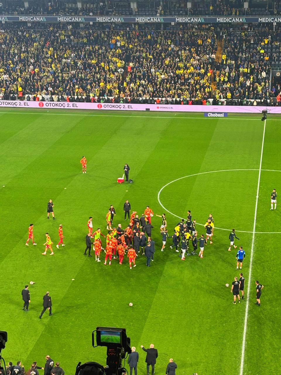 Süper Lig’de Fenerbahçe ile Galatasaray’ı karşı karşıya getiren dev derbinin ilk düdüğü henüz çalmadan ortalık karıştı. Türkiye’nin nefesini tutup izlediği maç öncesi sahada tansiyon bir anda yükseldi. Karşılaşmaya yaklaşık yarım saat kala iki takımın futbolcuları arasında sözlü atışmayla başlayan gerilim bir anda hararetlendi. Fenerbahçe kalecisi İrfan Can Eğribayat ile bazı Galatasaraylı oyuncular arasında yaşanan tartışma kısa sürede büyüyerek diğer futbolcuların da dahil olduğu bir arbedeye dönüştü. Sahada itişmeler, gergin bakışmalar ve tansiyonu artıran sözler havada uçuşurken teknik ekipler ve görevliler ortamı sakinleştirmek için adeta seferber oldu. Neyse ki olay kontrolden çıkmadan yatıştırıldı ve iki takım oyuncuları güçlükle de olsa ayrılarak soyunma odalarının yolunu tuttu. Ancak yaşanan bu sıcak temas, dev derbi öncesi atmosferi daha ilk dakikalardan elektriklendirmeye yetti; Kadıköy’de maç başlamadan kıvılcımlar çakmaya başladı.