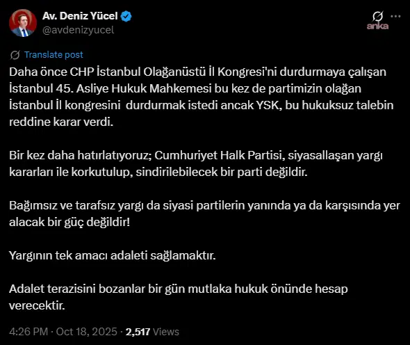 CHP Sözcüsü Deniz Yücel, sosyal medya hesabından yaptığı paylaşımda Yüksek Seçim Kurulu'nun partisinin İstanbul Olağan İl Kongresi'nin durdurulmasına yönelik talebi reddetmesi kararına ilişkin olarak, şunları kaydetti: