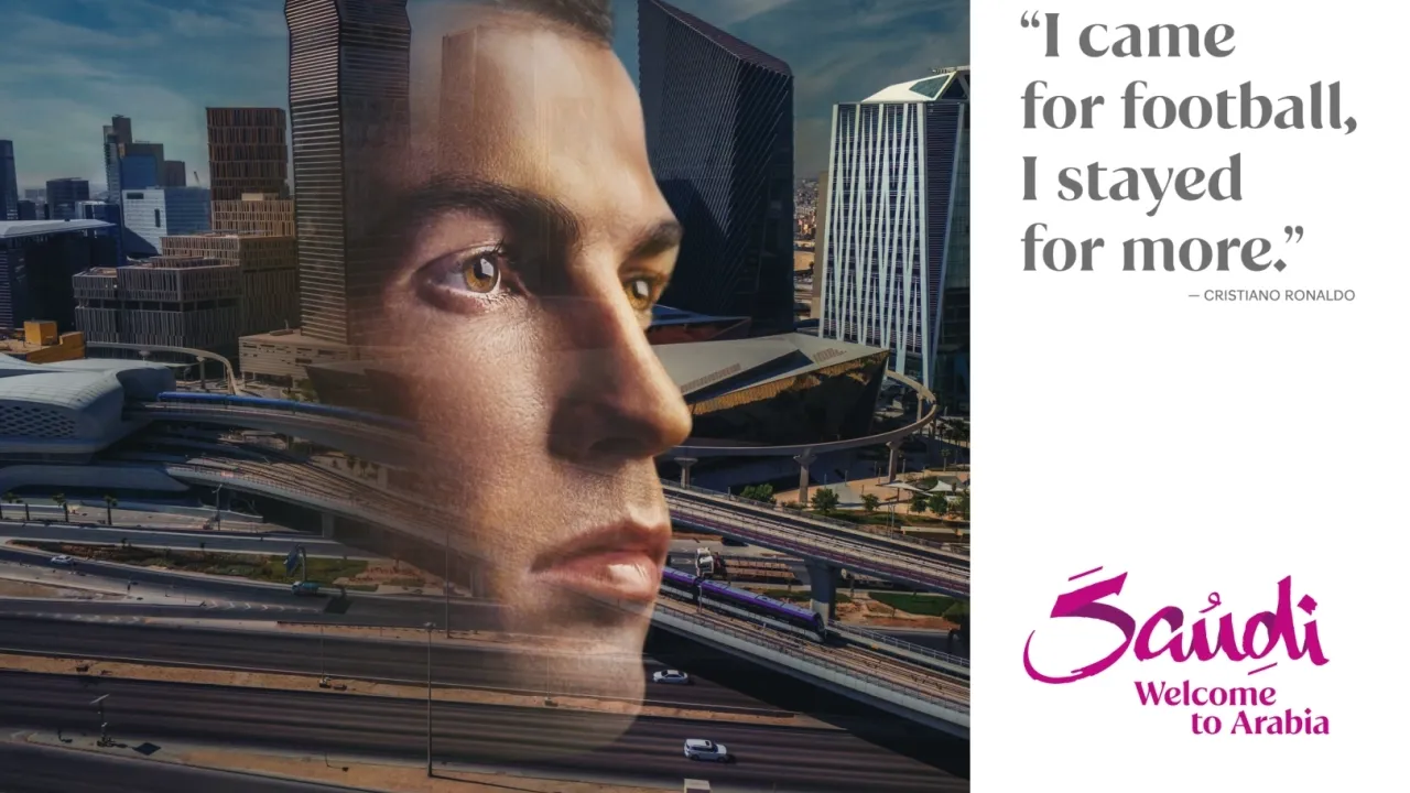 Suudi Arabistan'da düzenlenen çeşitli etkinlikleri tanıtan bu yılki Suudi turizm kampanyasının reklam yüzü futbol yıldızı Cristiano Ronaldo oldu. Suudi Arabistan’ın küresel marka elçisi Cristiano Ronaldo’nun yer aldığı “Futbol İçin Geldim, Daha Fazlası İçin Kaldım” kampanyasının ikinci videosu yayımlandı. Ülkenin ikonik destinasyonlarını mercek altına alan kesit, izleyicileri ilham dolu bir keşif yolculuğuna çıkarıyor.