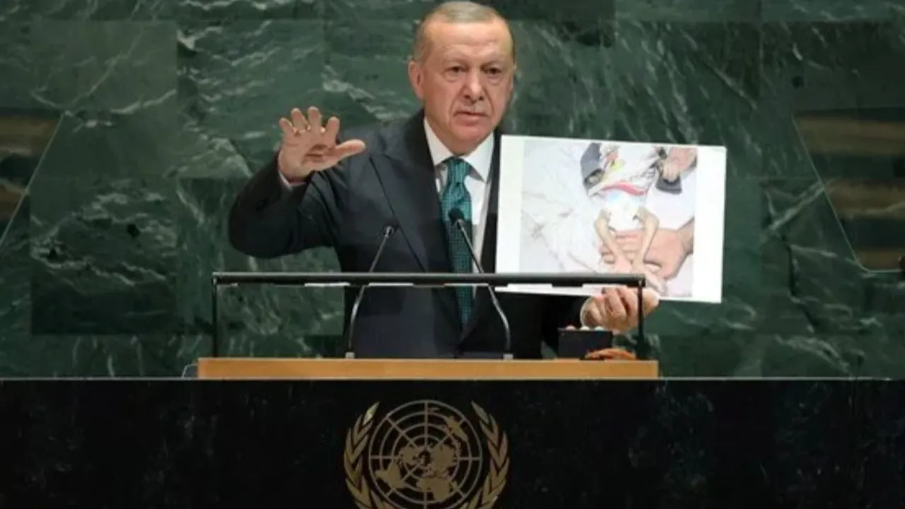 Hitabında, önceki senelerde katıldığı toplantılarda olduğu gibi bu sene de dünyanın dikkatini Gazze''de yaşanan soykırıma çeken Erdoğan, İsrail''in yaptığı soykırımı fotoğraflar ile belgeledi.