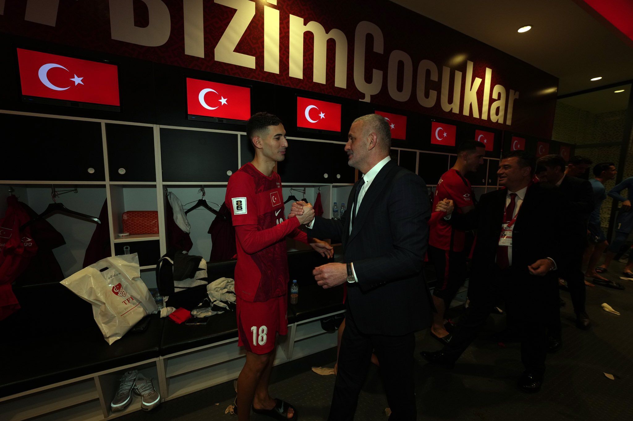 Öte yandan, karşılaşmanın son düdüğünün ardından Gençlik ve Spor Bakanı Dr. Osman Aşkın Bak ile TFF Başkanı İbrahim Ethem Hacıosmanoğlu soyunma odasına inerek takımın coşkusuna ortak oldu. İkili, Teknik Direktör Vincenzo Montella ve milli oyuncuları yüz yüze tebrik ederek yaklaşan zorlu Kosova finali öncesi takıma moral aşıladı.