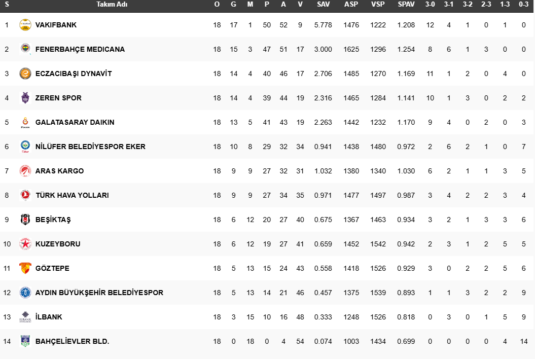 Vodafone Sultanlar Ligi'nde Vakıfbank liderliğini sürdürürken Fenerbahçe Medicana zirveyi yakından ilgilendiren maçta Eczacıbaşı Dynavit'i 3-1'le geçti. Lig'te 18. hafta oynanan müsabakaların ardından oluşan puan tablosu şu şekilde: