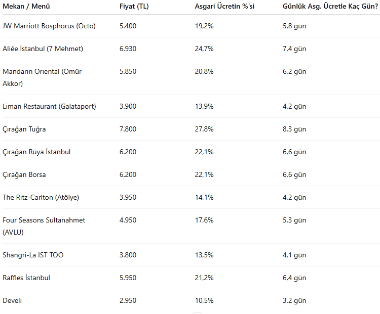 Çırağan Palace Kempinski’nin Tuğra Restaurant’ındaki iftar menüsü 7 bin 800 TL ile asgari ücretin yüzde 28’ine denk geliyor. Bu, günlük 935 TL kazanan bir çalışanın menüyü satın almak için yaklaşık 8,3 gün çalışması gerektiği anlamına geliyor. Benzer şekilde, Aliée İstanbul (7 Mehmet Restaurant) menüsü 6 bin 930 TL ile maaşın neredeyse çeyreğini alıyor.