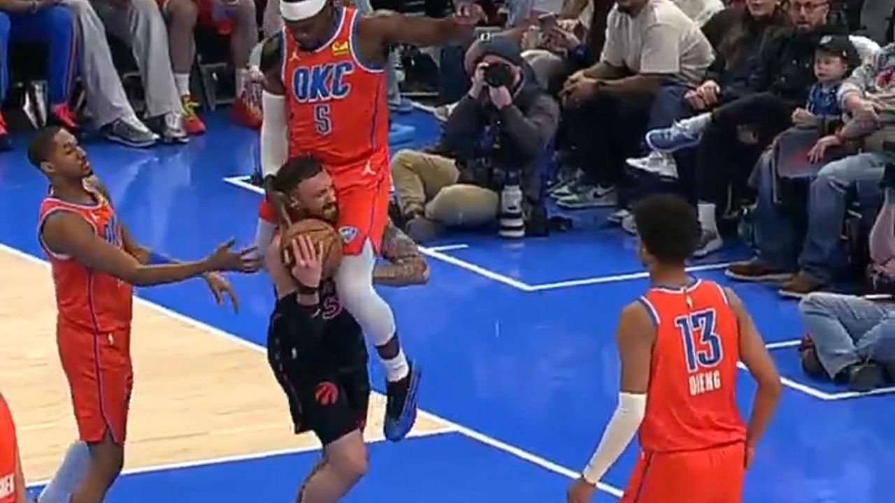 Oklahoma City Thunder ile Toronto Raptors arasındaki mücadelede yaşanan ilginç pozisyon, hem oyuncuları hem de izleyenleri güldürdü. Luguentz Dort, blok yapmak isterken kendini Kelly Olynyk'in omuzlarında buldu.