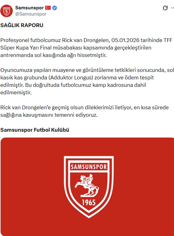 Açıklamada, "Oyuncumuza yapılan muayene ve görüntüleme tetkikleri sonucunda, sol kasık kas grubunda zorlanma ve ödem tespit edilmiştir. Bu doğrultuda futbolcumuz kamp kadrosuna dahil edilmemiştir. Rick van Drongelen'e geçmiş olsun dileklerimizi iletiyor, en kısa sürede sağlığına kavuşmasını temenni ediyoruz." ifadelerine yer verildi.