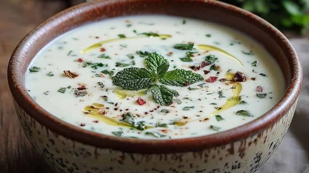 “Haşlanmış pirinç veya arpa, bu kremalı yoğurt çorbasına taneli bir tatlılık katar. Kış aylarında soğuk algınlığını önlediği düşünülür; bazı Türk hastaneleri, iyileşmekte olan hastalara yoğurt çorbası bile servis eder. Kurutulmuş nane parçaları, yoğurdun hafif ekşiliğini dengelemeye yardımcı olur. Yumuşacık, yuvarlak taze pide ekmeği ile servis edin.”