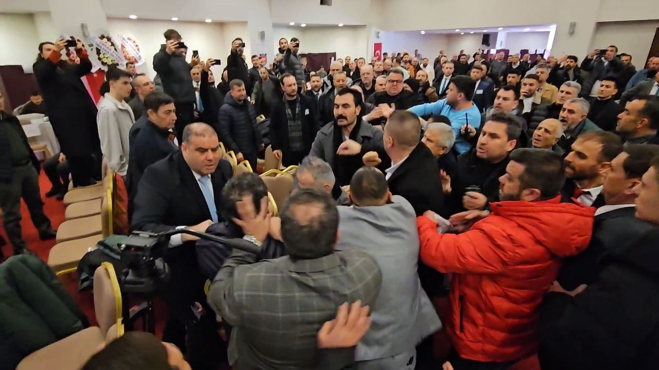 Mavi liste adayı Aytaç Dilci’nin konuşmasının ardından kürsüye çıkan mevcut Başkan Ali Şahin’e salondan bir söz gelmesi tansiyonu yükseltti. Sözlü atışmalar kısa sürede fiziksel kavgaya dönüştü.