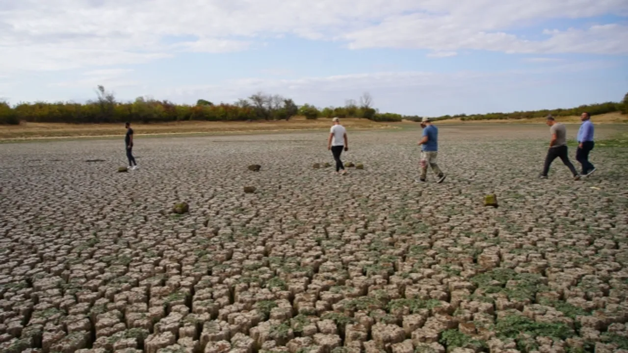 Kuruma nedeniyle göletin tabanında derin çatlaklar oluştu, besiciler farklı su kaynaklarından hayvanlarını sulamaya çalışıyor.