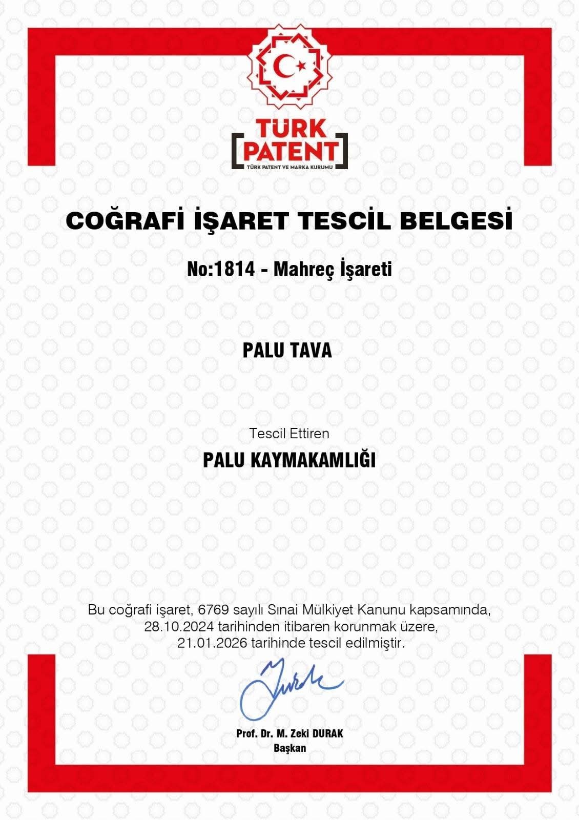Elazığ’ın Palu ilçesinde ilçeye özgü lezzetlerden biri olan Palu Tava, Türk Patent ve Marka Kurumu tarafından coğrafi işaret tescil belgesi aldı. Tescil kararı, kaymakamlık girişimleri sonucu 21 Ocak 2026 tarihi itibarıyla resmen kabul edildi.