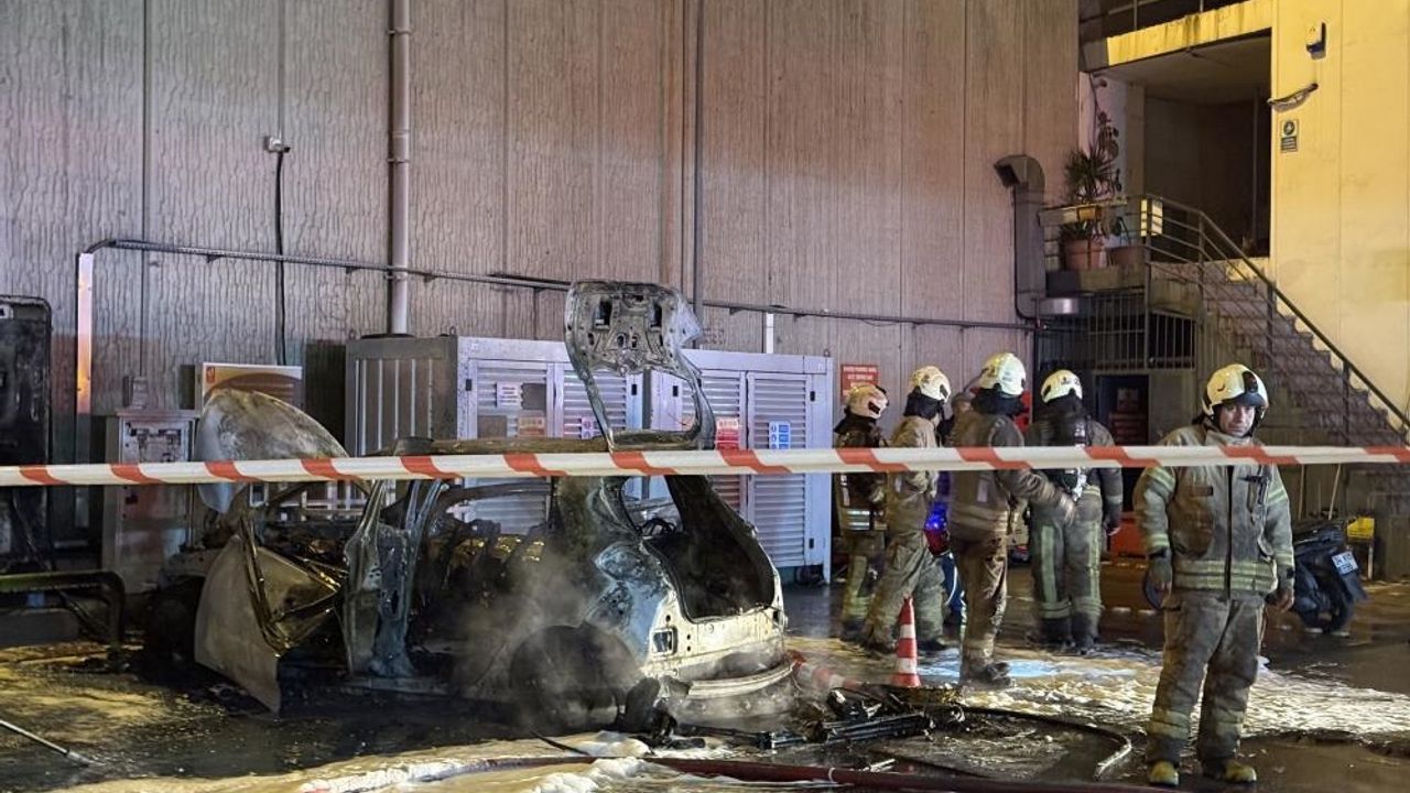 Akaryakıt istasyonunda şarja takılı olan bir elektrikli araç aniden alev alarak patladı. Patlama nedeniyle panik oluşurken, yanan araç itfaiye ekiplerince söndürüldü.