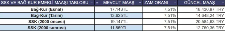 SSK VE BAĞ-KUR EMEKLİSİ MAAŞ TABLOSU