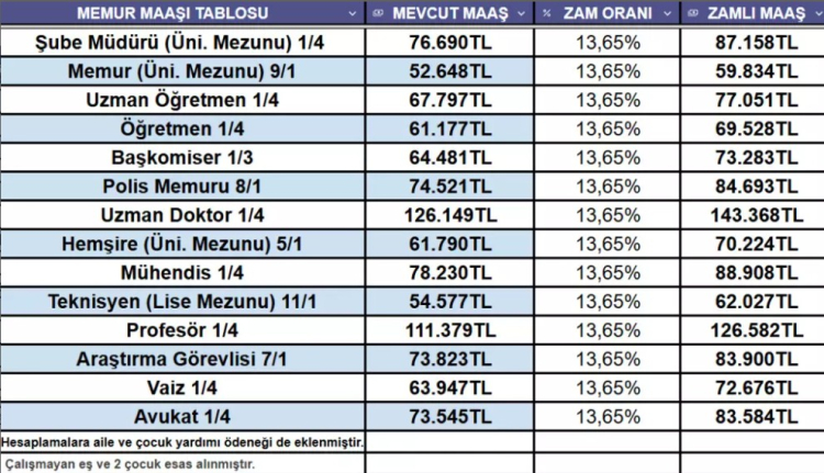 3 AYLIK ENFLASYON FARKINA GÖRE MEMUR MAAŞ TABLOSU