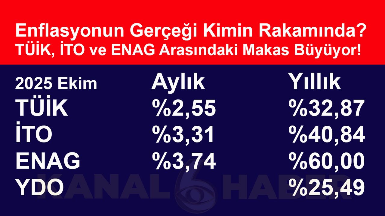 2025 Ekim ayı enflasyon rakamları açıklandı. Enflasyon oranlarında TÜİK, İTO ve ENAG arasındaki makas büyüyor. Ekim Enflasyonunda Rakamlar arasındaki fark adeta uçurum gibi. Farklar ekonomiye güven tartışmasını alevlendirdi.