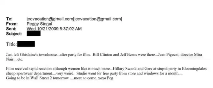 Yayınlanan belgeler arasında yer alan 21 Ekim 2009 tarihli bir e-posta, Hollywood ile Epstein çevresi arasındaki yakınlığı bir kez daha gözler önüne serdi. Ünlü halkla ilişkiler sorumlusu Peggy Siegal tarafından Jeffrey Epstein’e gönderilen mesajda, Mira Nair’in yönettiği "Amelia" filminin galası sonrası düzenlenen özel partinin detayları yer alıyor.