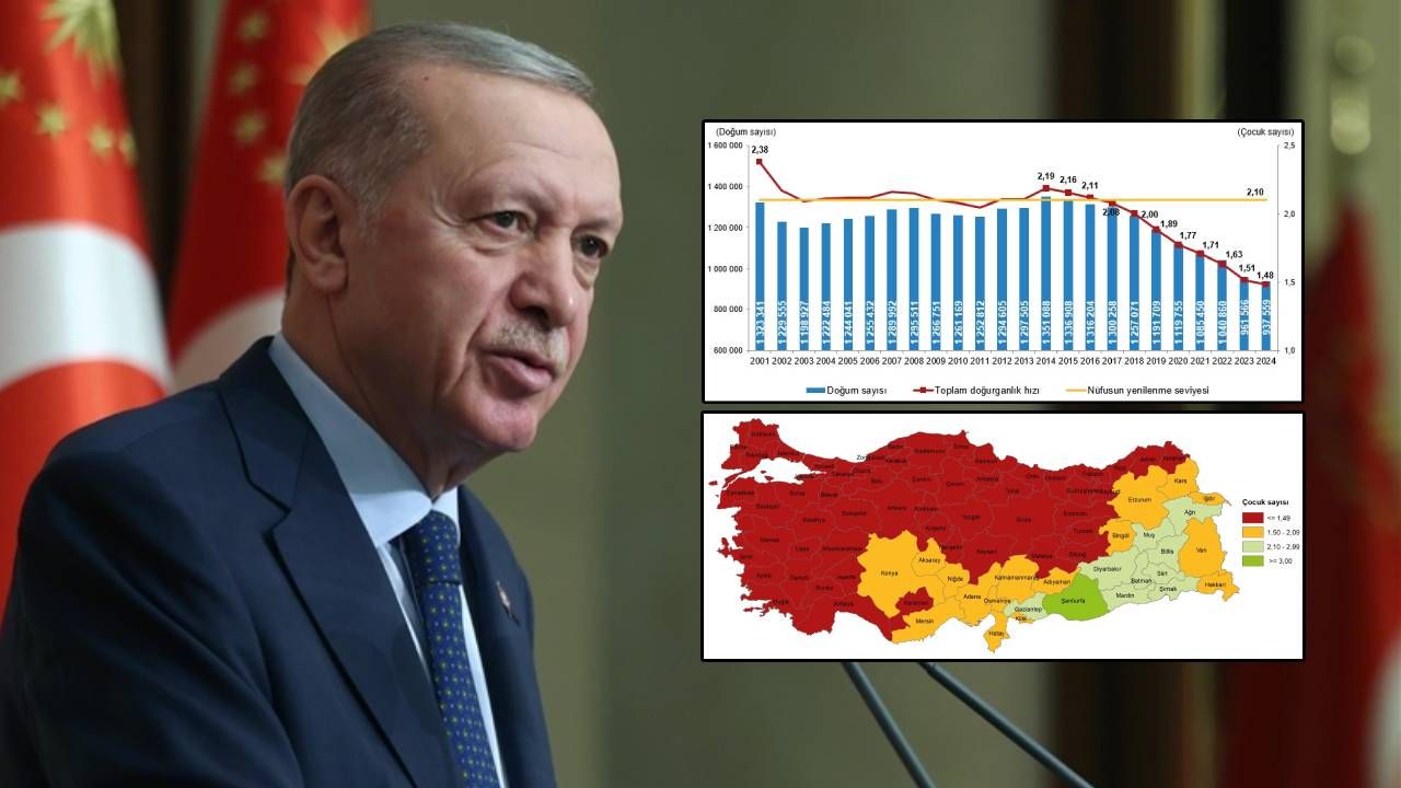 Türkiye İstatistik Kurumu’nun (TÜİK) yayımladığı 2024 Doğum İstatistikleri Raporu, Cumhurbaşkanı Erdoğan’ın uyarılarını destekleyen çarpıcı veriler ortaya koydu. Rapora göre, Türkiye’nin toplam doğurganlık hızı 1,48 çocuk olarak gerçekleşti. Bu oran, nüfusun kendini yenileme eşiği olan 2,10’un oldukça altında kaldı.