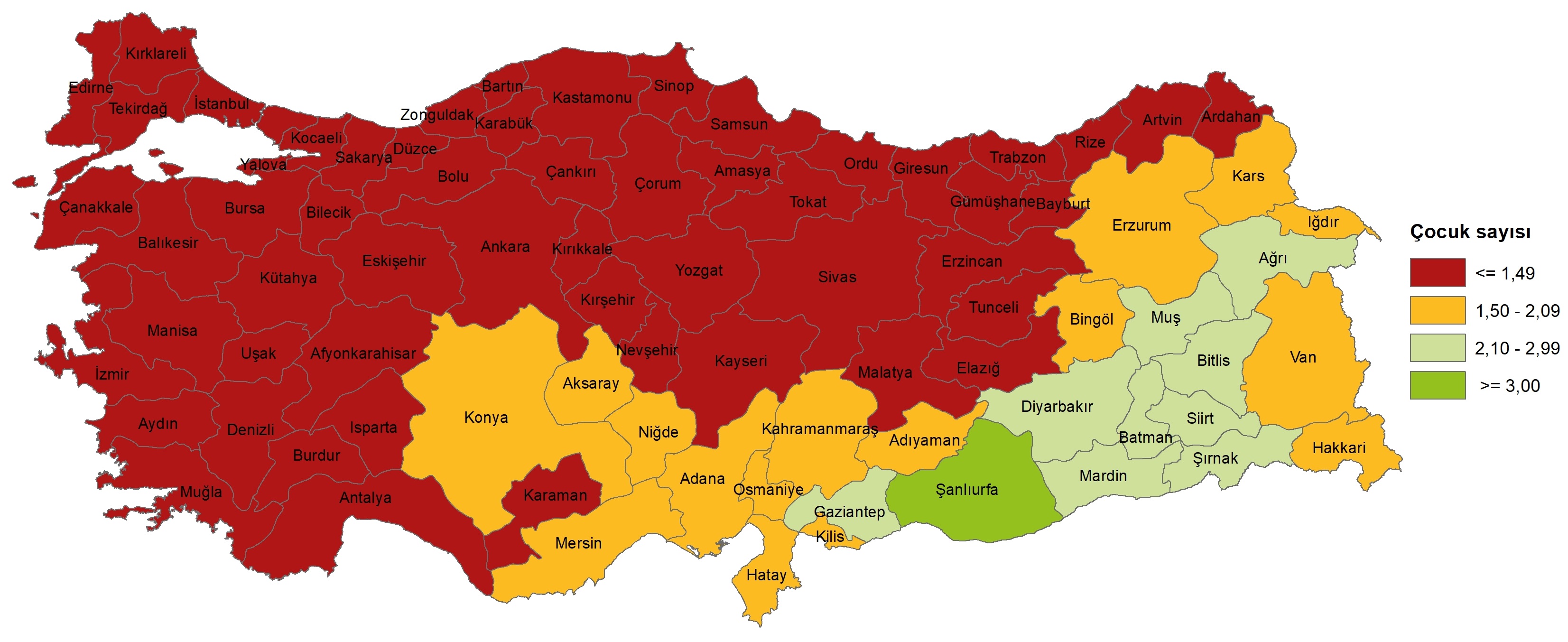 Toplam doğurganlık hızının en yüksek olduğu il 2024 yılında 3,28 çocuk ile Şanlıurfa oldu. Bu ili 2,62 çocuk ile Şırnak, 2,32 çocuk ile Mardin izledi.