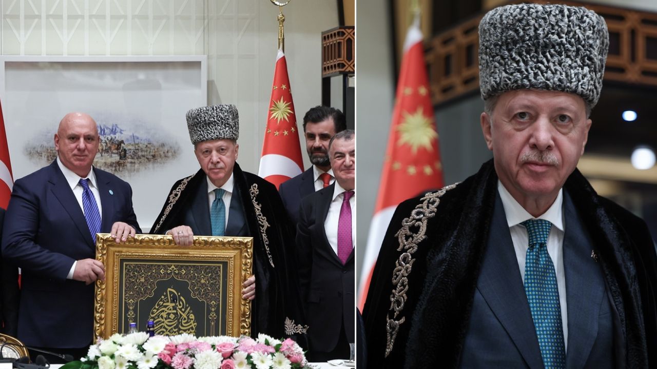 Heyet, Cumhurbaşkanı Erdoğan'a kalpak hediye etti. Hediyeleri kabul eden Erdoğan, kalpak takarak kameralara poz verdi.