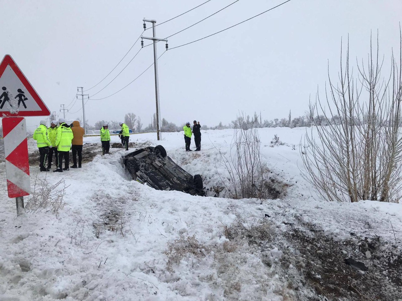 Edinilen bilgilere göre, karlı yol nedeniyle kontrolden çıkan polis aracı şarampole yuvarlandı.