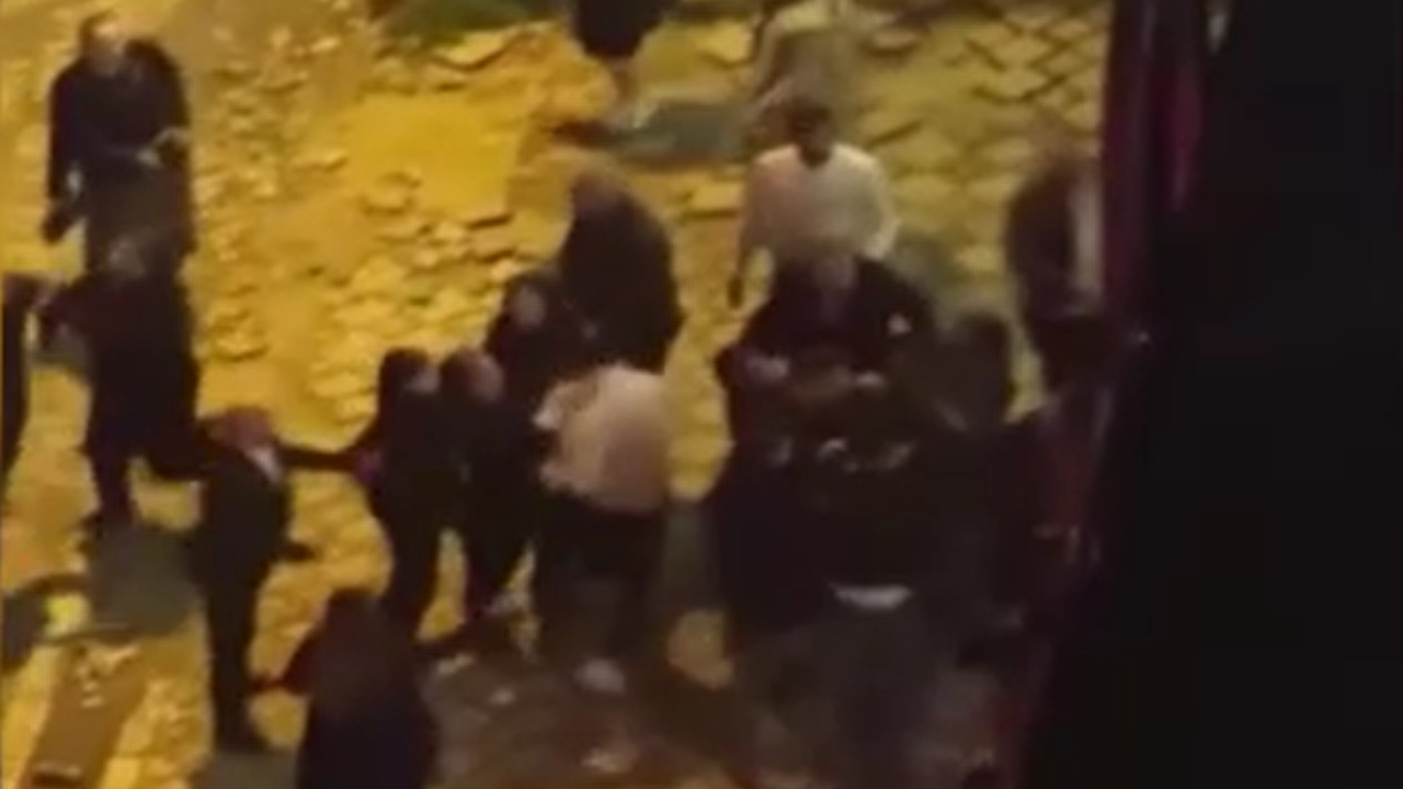 Görüntülerde, kalabalık iki grubun birbirine tekme ve yumruklarla saldırdığı anlar yer aldı.