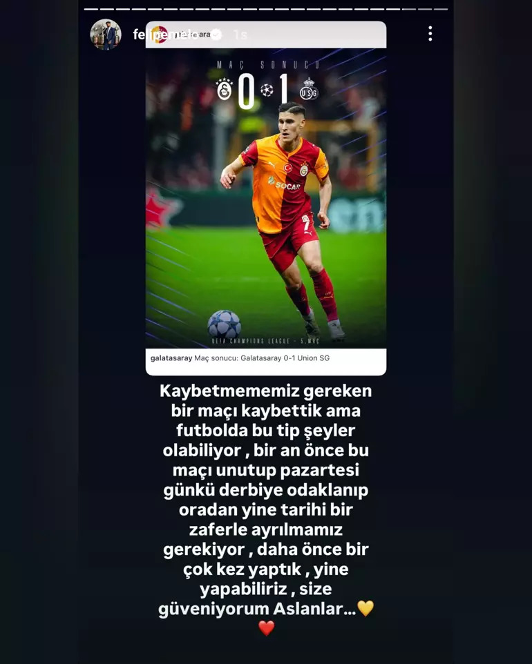 Sarı Kırmızılı ekibin eski futbolcusu Felipe Melo, yaklaşan Fenerbahçe derbisiyle ilgili şu ifadeleri kullandı: "Kaybetmememiz gereken bir maçı kaybettik ama futbolda bu tip şeyler olabiliyor. Bir an önce bu maçı unutup, pazartesi günkü derbiye odaklanıp, oradan yine tarihi bir zaferle ayrılmamız gerekiyor. Daha önce birçok kez yaptık. Yine yapabiliriz. Size güveniyorum aslanlar."