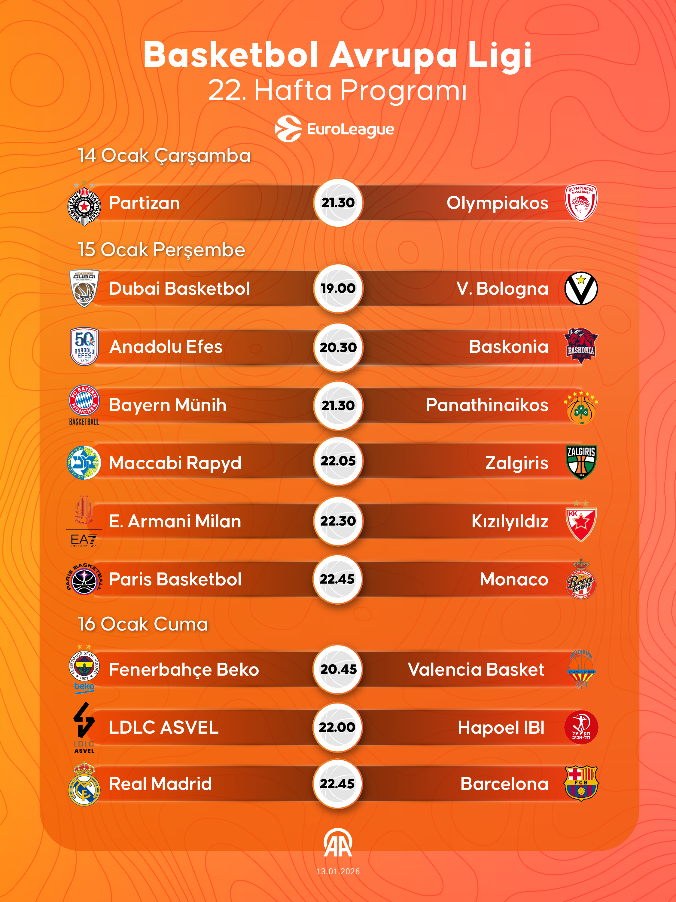 Basketbol Avrupa Ligi'nde (EuroLeague) 22. hafta heyecanı yarın başlayacak. Avrupa basketbolunun kulüpler düzeyindeki bir numaralı organizasyonunda 22. hafta maçları yarın, 15 Ocak Perşembe ve 16 Ocak Cuma günü oynanacak.