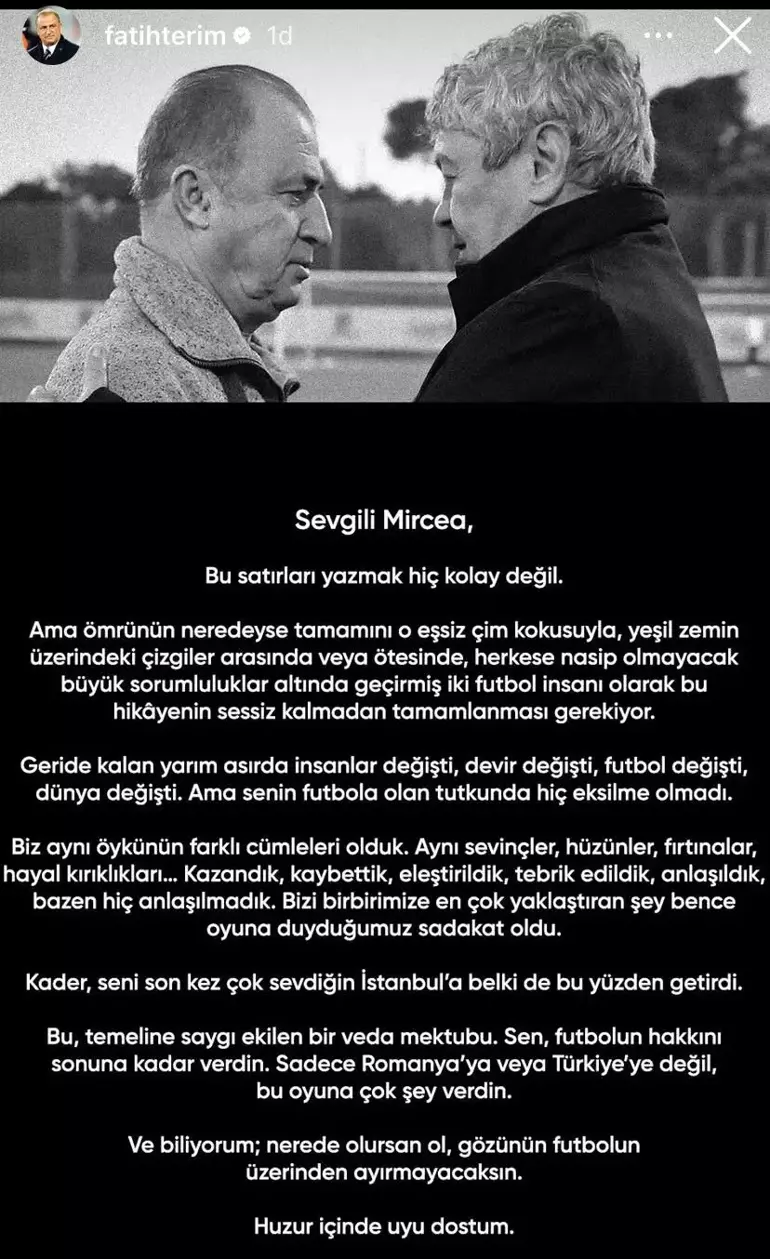 Terim, sosyal medya hesaplarından paylaştığı mektubunda böylesi bir vedanın zorluğuna dikkat çekerek, sözlerine şu ifadelerle başladı: "Sevgili Mircea, bu satırları yazmak hiç kolay değil. Ama ömrünün neredeyse tamamını o eşsiz çim kokusuyla, yeşil zemin üzerindeki çizgiler arasında veya ötesinde, herkese nasip olmayacak büyük sorumluluklar altında geçirmiş iki futbol insanı olarak bu hikâyenin sessiz kalmadan tamamlanması gerekiyor."