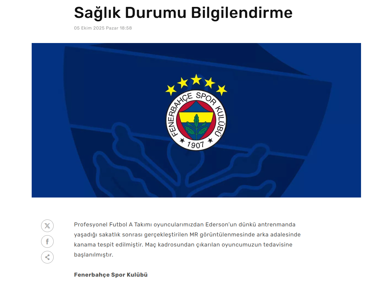 Fenerbahçe’den yapılan açıklamada, “Profesyonel oyuncularımızdan Ederson’un yaşadığı sakatlık sonrası yapılan MR sonucunda arka adalesinde kanama tespit edilmiştir. Oyuncumuzun tedavisine başlanmıştır” ifadeleri kullanılmıştı.