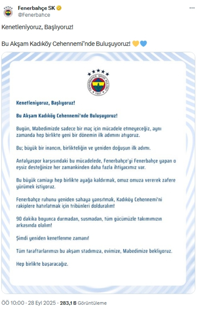 Fenerbahçe, Kadıköy’deki Antalyaspor maçı öncesi taraftarlarına yönelttiği çağrıyla yeni bir dönemin başlangıcını resmen duyurdu. Kulübün sosyal medya hesaplarından yayımlanan mesaj, yeni seçilen başkan Sadettin Saran’ın ilk lig sınavı öncesinde tribünleri birleştirme amacı taşıyor. Yönetimin metninde sık sık ''kenetlenme'' ve ''yeni bir dönem'' vurgusu tekrarlanıyor mesaj taraftarlardan maç boyunca susmama ve takıma destek verme talebini net biçimde içeriyor.
