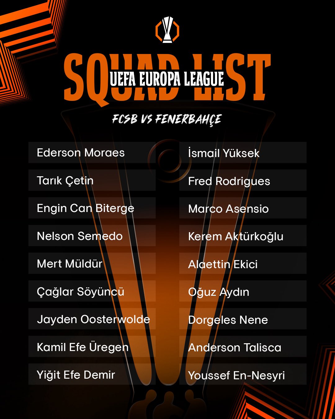 Temsilcimiz Fenerbahçe'nin yarın akşam deplasmanda Romanya temsilcisi FCSB ile oynayacağı Avrupa ligi maçının kamp kadrosu belli oldu. Kadroda şu isimler yer alıyor: