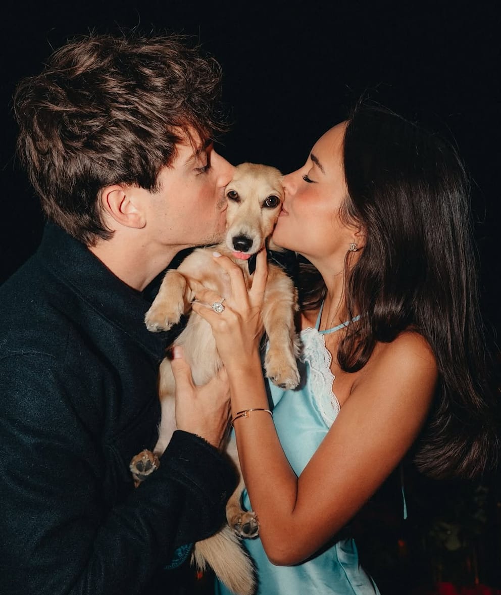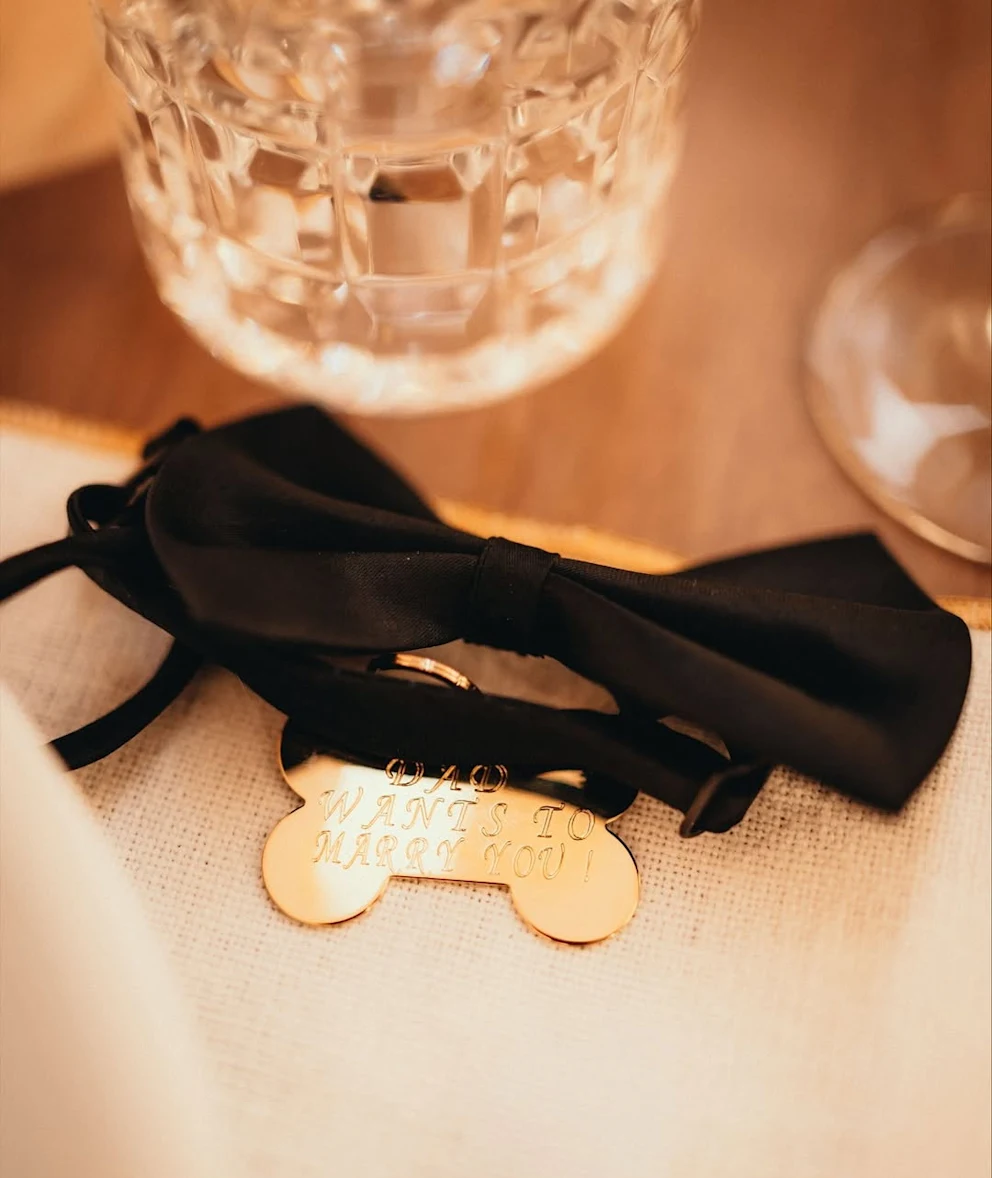 Sosyal medyada paylaşılan fotoğraflarda, köpeğin boynunda “Baba seninle evlenmek istiyor” yazılı bir tasma ve çevresinde güller görüldü. Bu sevimli teklifin ardından Saint Mleux “evet” dedi.