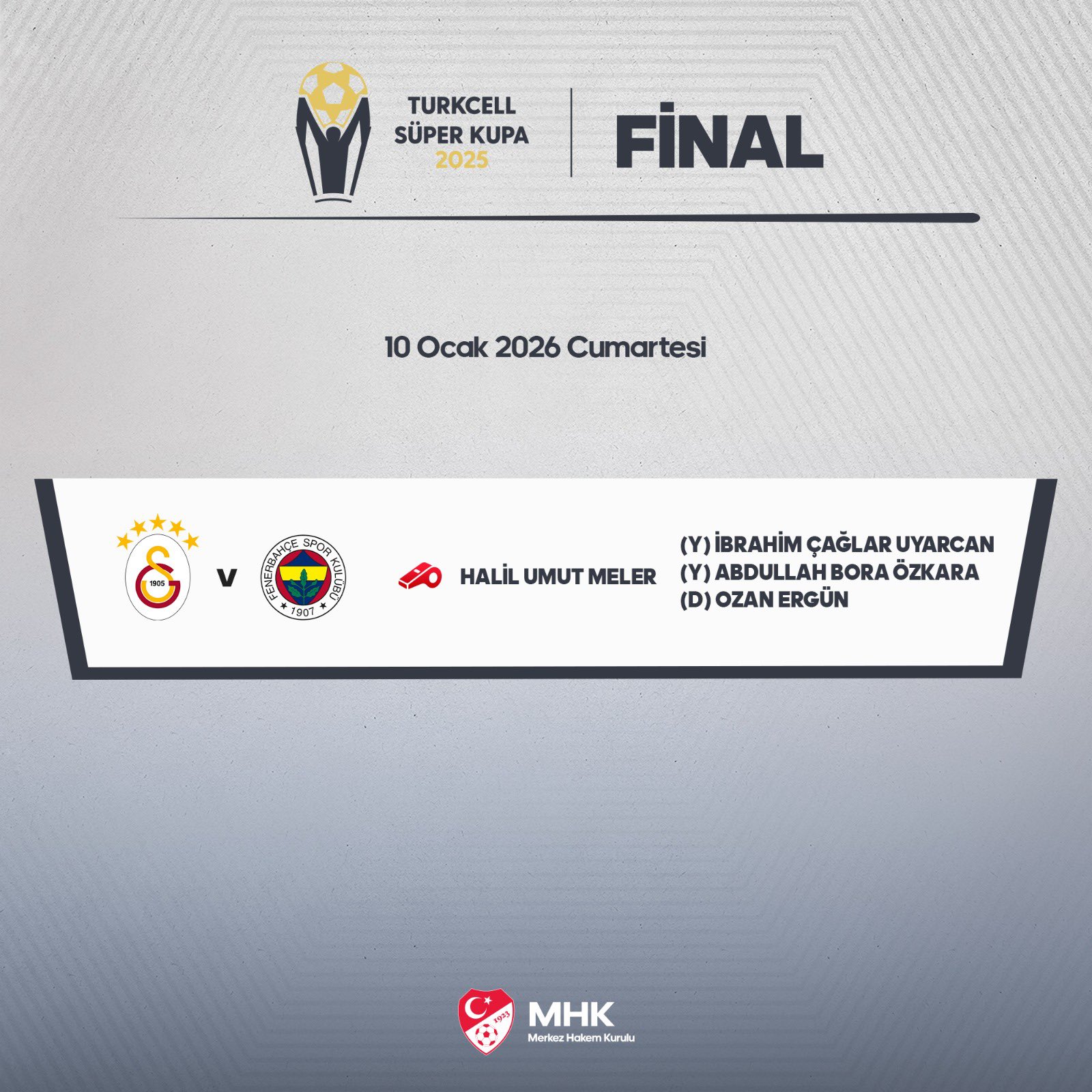 Bu sezon ilk yeni formatıyla düzenlenen Turkcell Süper Kupa finali yarın akşam oynanacak. MHK, ezeli derbiyi İzmir Bölgesi FIFA Hakemi Halil Umut Meler’in yöneteceğini açıkladı.