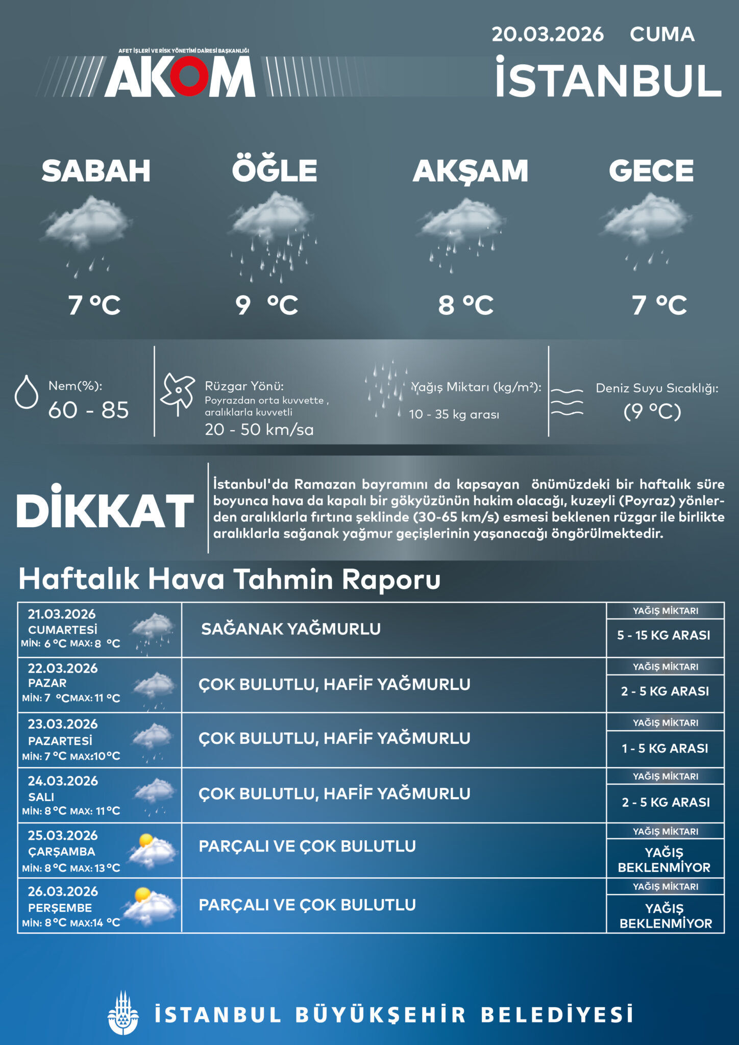 İstanbul Büyükşehir Belediyesi Afet İşleri Dairesi Başkanlığı (AKOM), bu haftaki hava durumu tahmin raporunu yayımladı. Bugün (20 Mart Cuma) sıcaklıklar 7-9°C bandında seyrederken, poyrazdan esen rüzgarın hızı saatte 50 kilometreye kadar çıkıyor. Şehir genelinde metrekareye 10 ila 35 kg arasında yağış düşmesi beklenirken, nem oranının %85 seviyelerine ulaşacağı tahmin ediliyor.