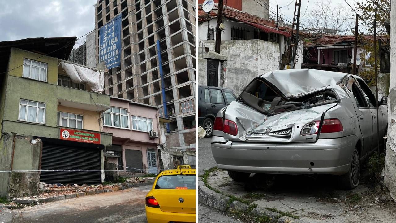 İstanbul'da etkili olan şiddetli lodos nedeniyle binanın çatısından kopan parçalar araçların üzerine düştü.