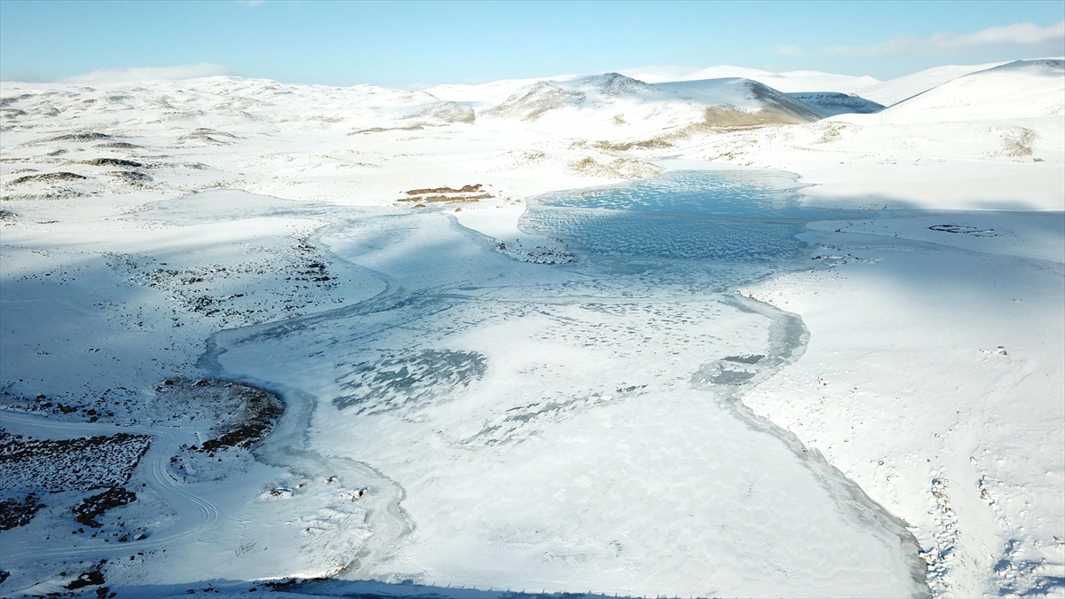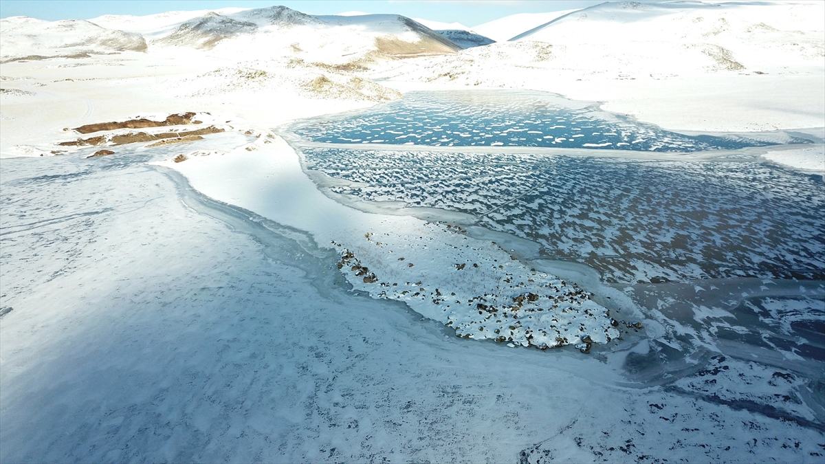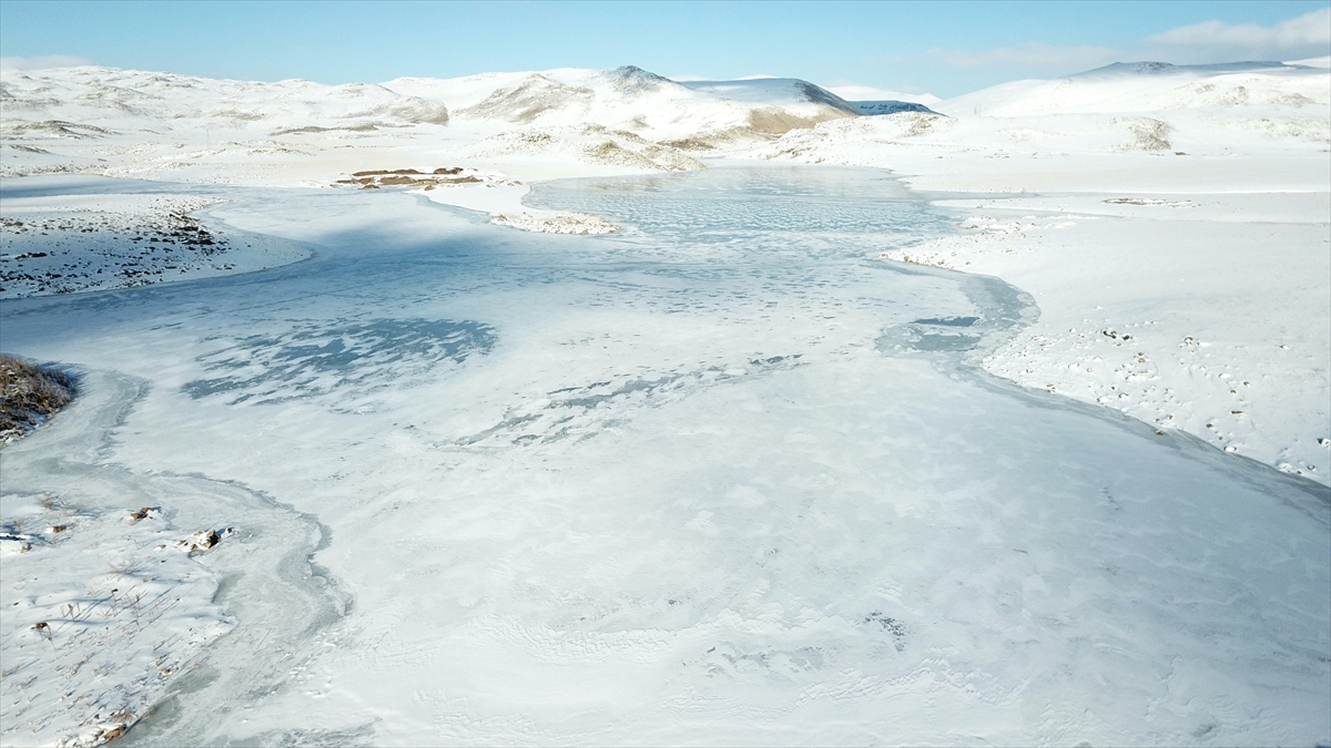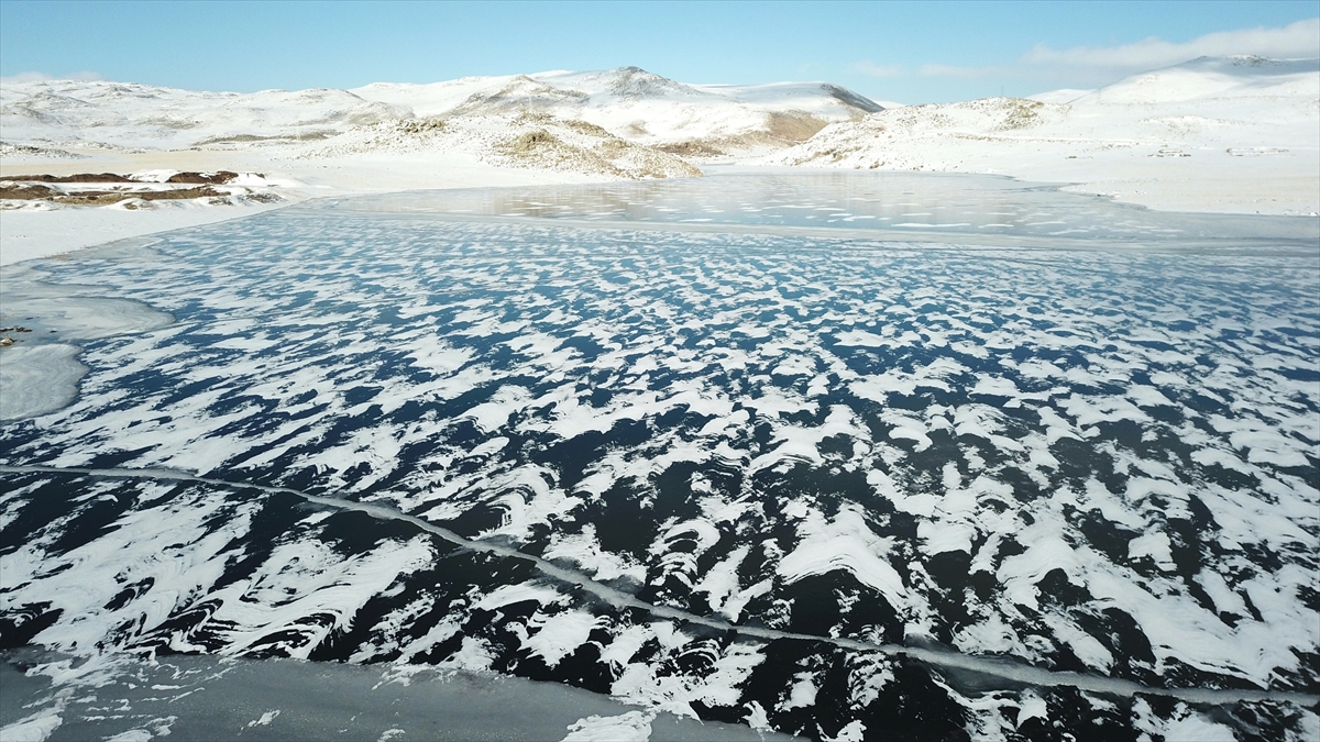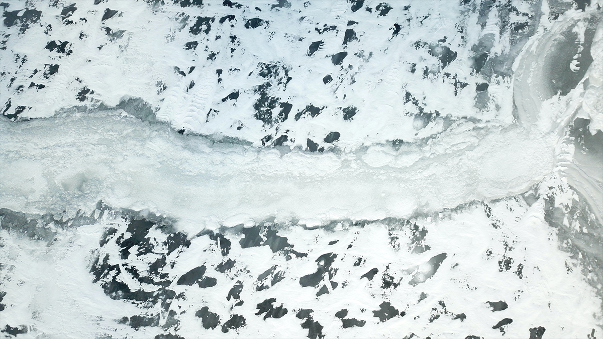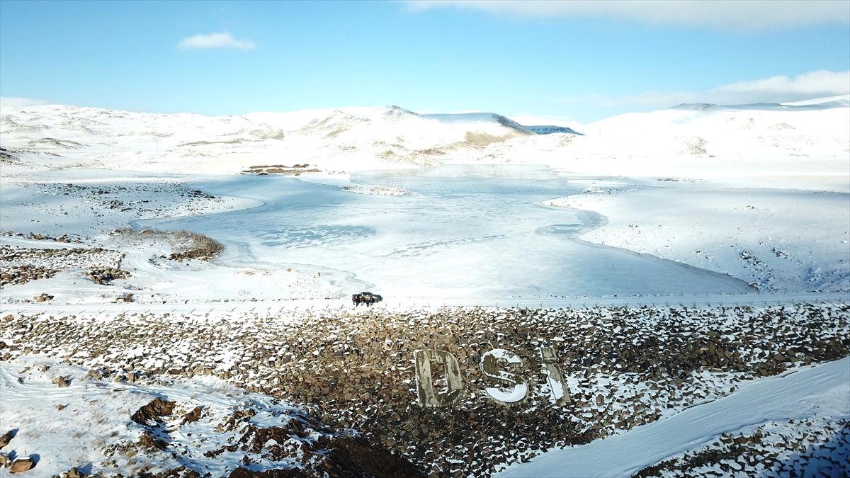 Çevresi karlı dağlarla kaplı olan ve güzel manzara oluşturan barajın buzla kaplı yüzeyi dronla görüntülendi.