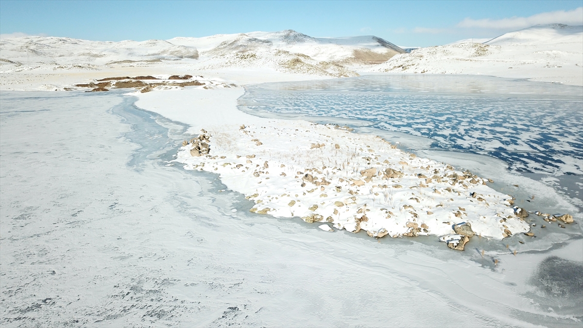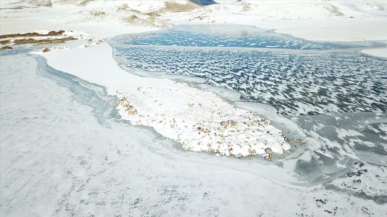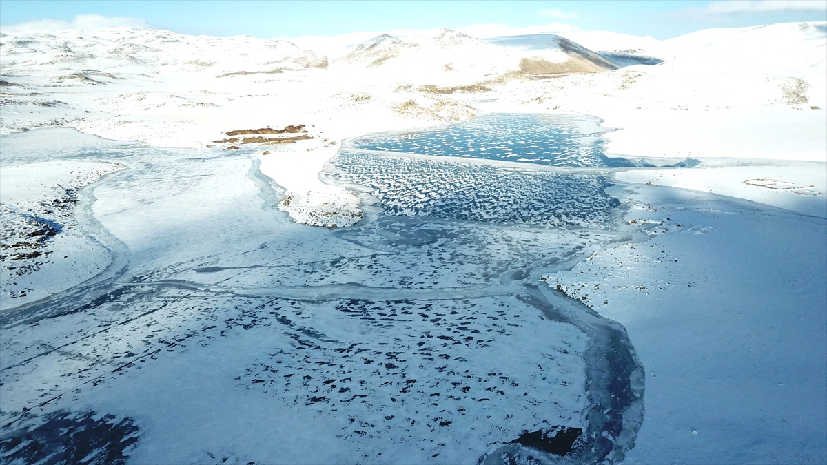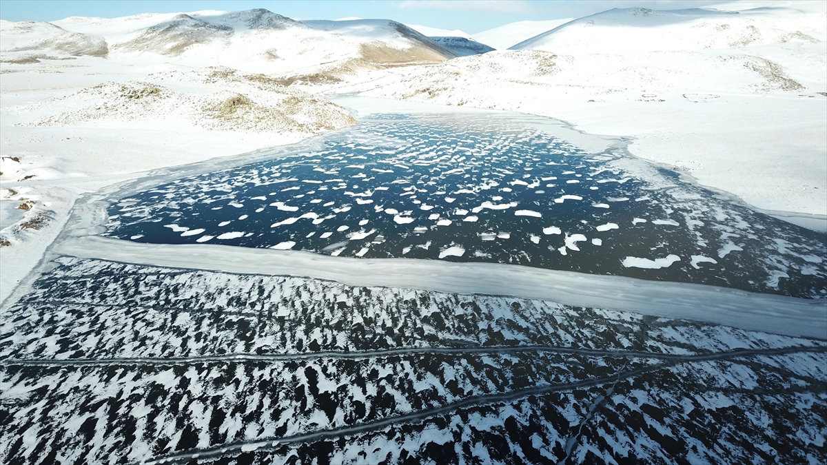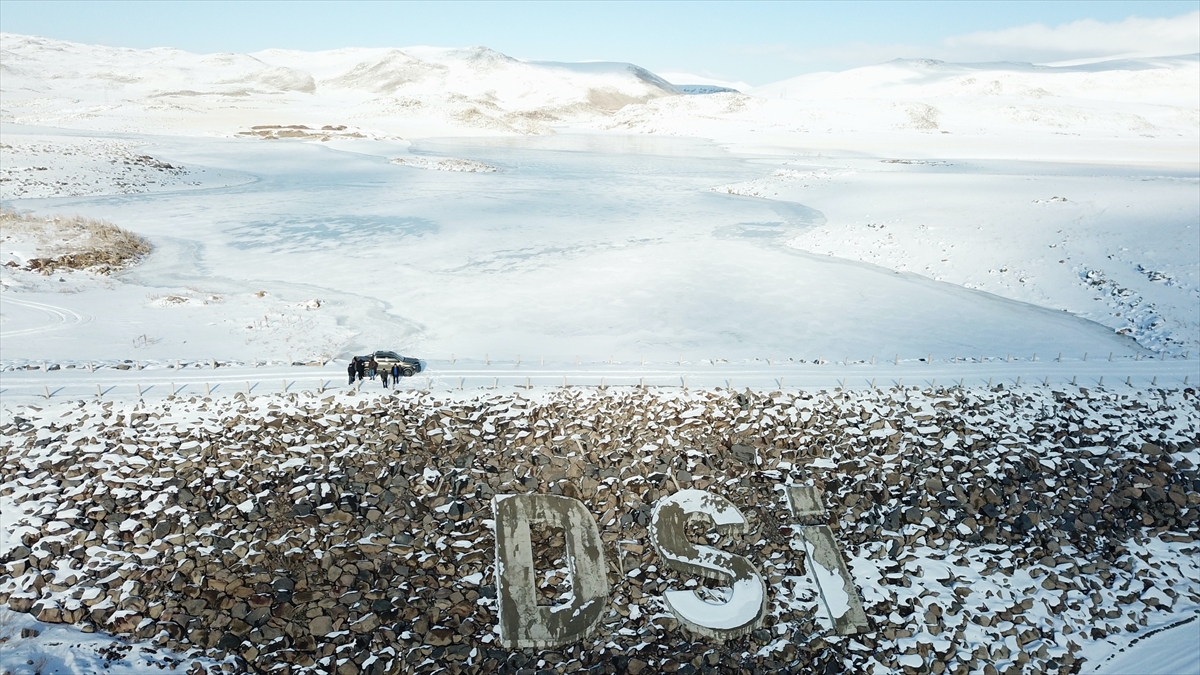 Çevresi karlı dağlarla kaplı olan ve güzel manzara oluşturan barajın buzla kaplı yüzeyi dronla görüntülendi.