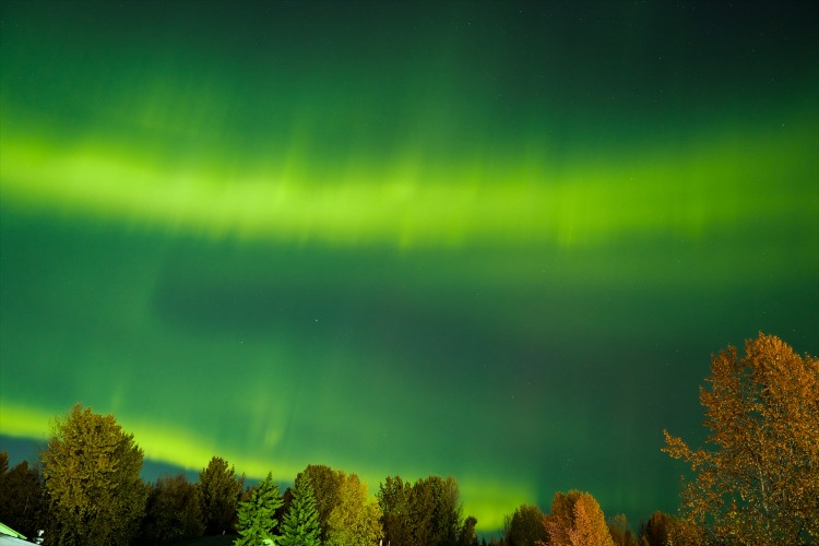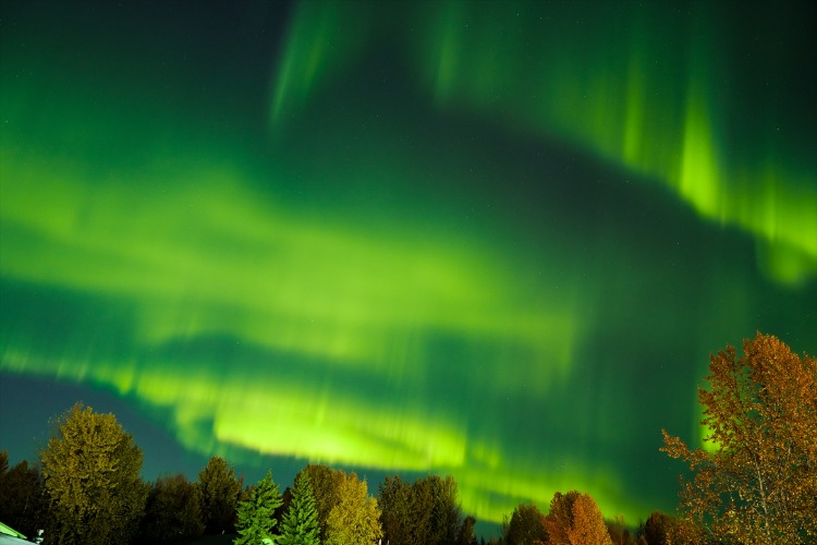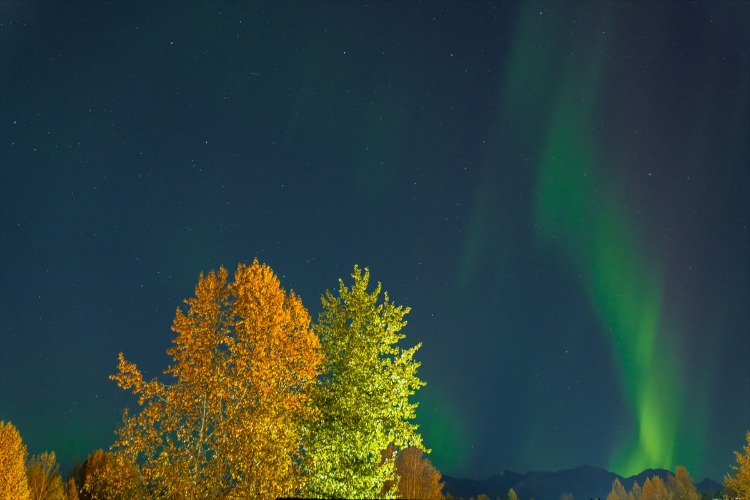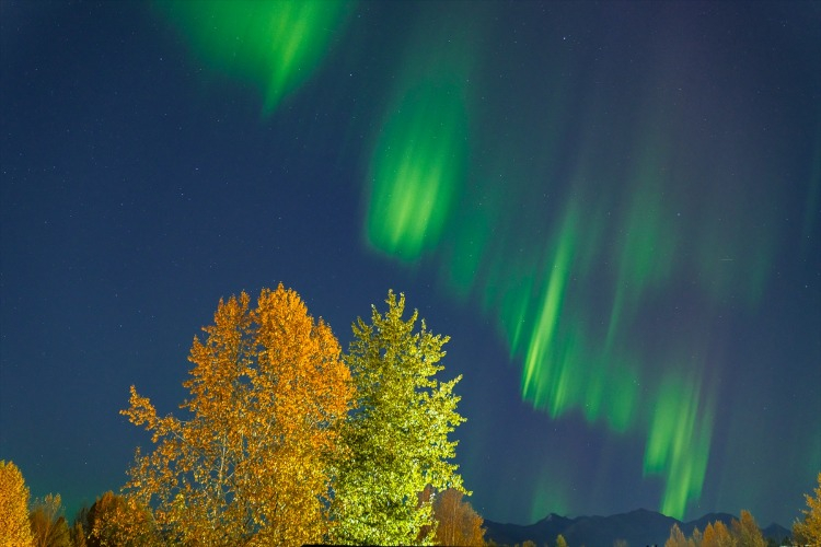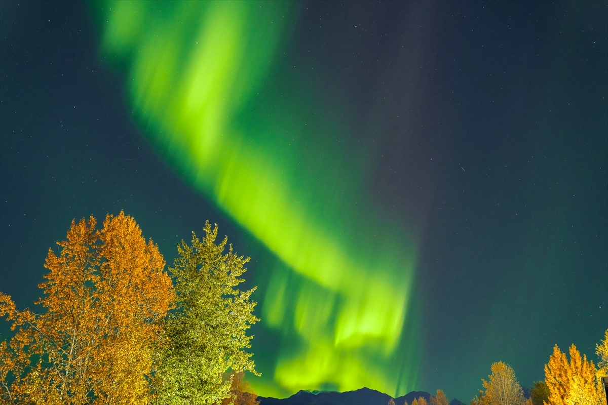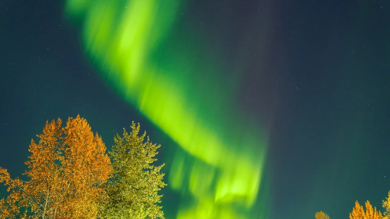Aurora, şehir semalarını ve gökyüzünü etkileyici bir şekilde aydınlatırken, sonbahara özgü sarı, turuncu ve kırmızı yaprak renkleriyle birleşerek unutulmaz bir manzara oluşturdu