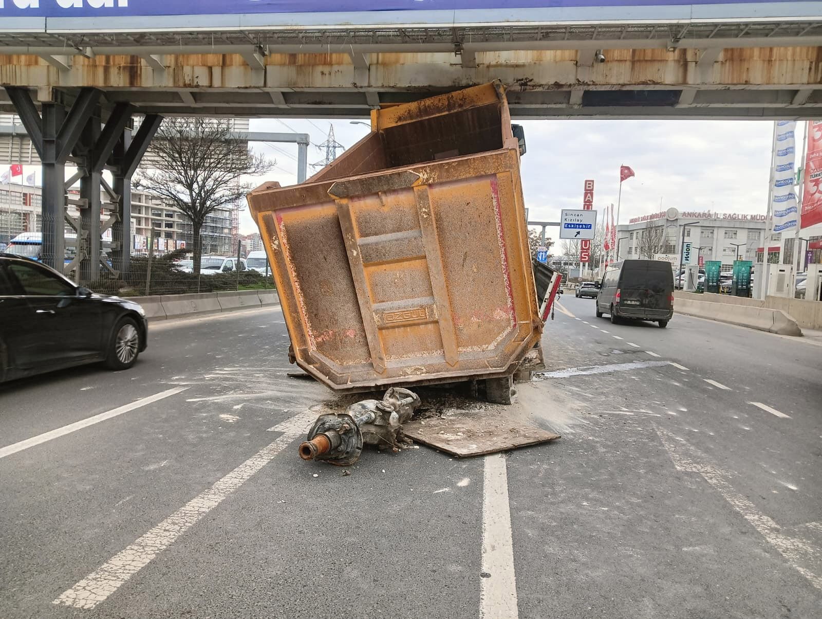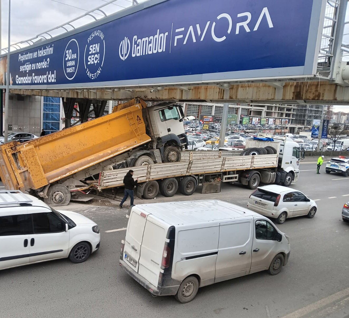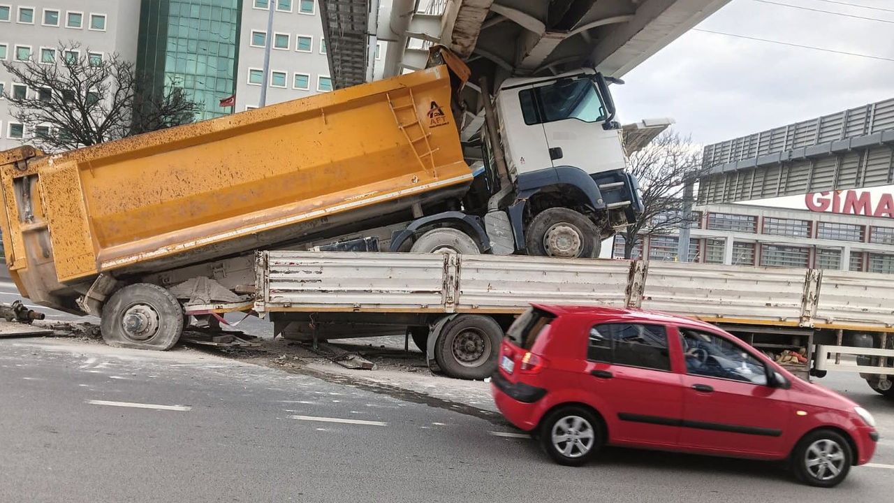 Çarpışmanın etkisiyle hafriyat kamyonu üst geçide sıkıştı ve bölgedeki trafik akışından aksama meydana geldi.