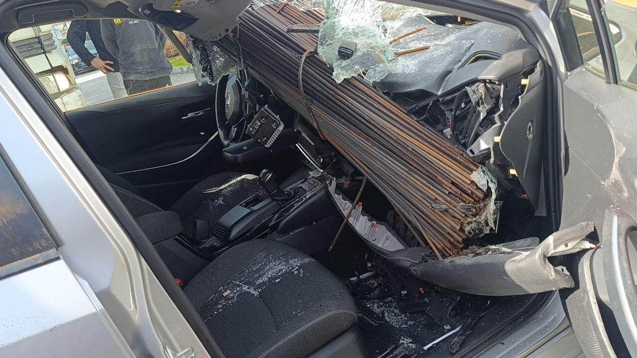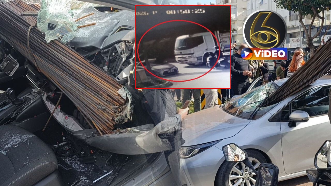 Antalya'nın Manavgat ilçesinde çekici üzerindeki inşaat demirlerinin otomobilin ön camından içeri girmesi sonucu meydana gelen kazada büyük şans eseri otomobilde bulunan 2 kişi hafif yaralandı. O anlar güvenlik kamerasına anbean yansıdı.