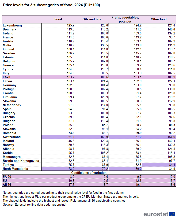 2024 yılında Avrupa’da gıda fiyatları ülkeler arasında önemli farklılıklar gösterdi. Gıda fiyatlarının en yüksek olduğu ülke, AB ortalamasının yüzde 25 üzerinde olan Lüksemburg oldu; onu yüzde 20 ile Danimarka izledi. AB içinde en ucuz gıda fiyatları ise Romanya’da gözlemlendi (yüzde 24 ortalamanın altında). Tüm 36 Avrupa ülkesi arasında ise en düşük gıda fiyatları Kuzey Makedonya’da kaydedildi.