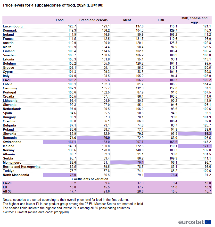 Buna karşın Romanya ekmek ve tahıl, Karadağ et, Kuzey Makedonya balık ve Slovakya süt ürünlerinde en ucuz fiyatları sundu.