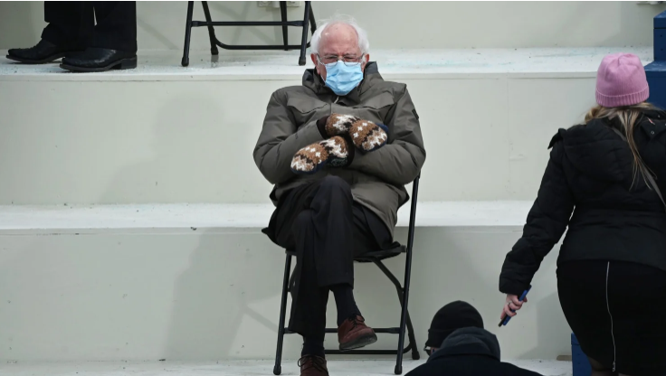 Sanders, ikonik pozunun benzerini yemin töreninde tekrarladı. Ancak, bu kez yüzü gülüyordu. Sanders'ın bu görüntüleri yeniden sosyal medyanın gündemine oturdu.