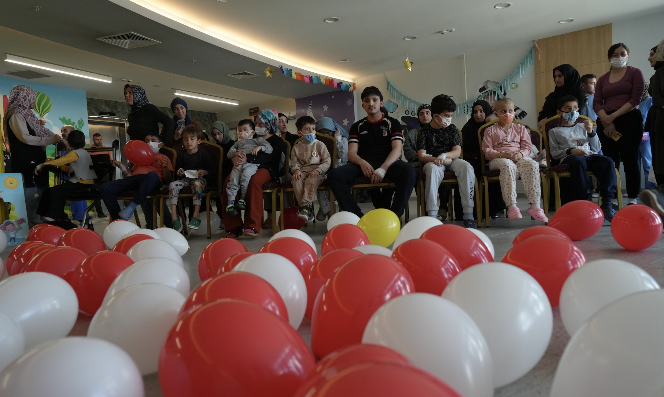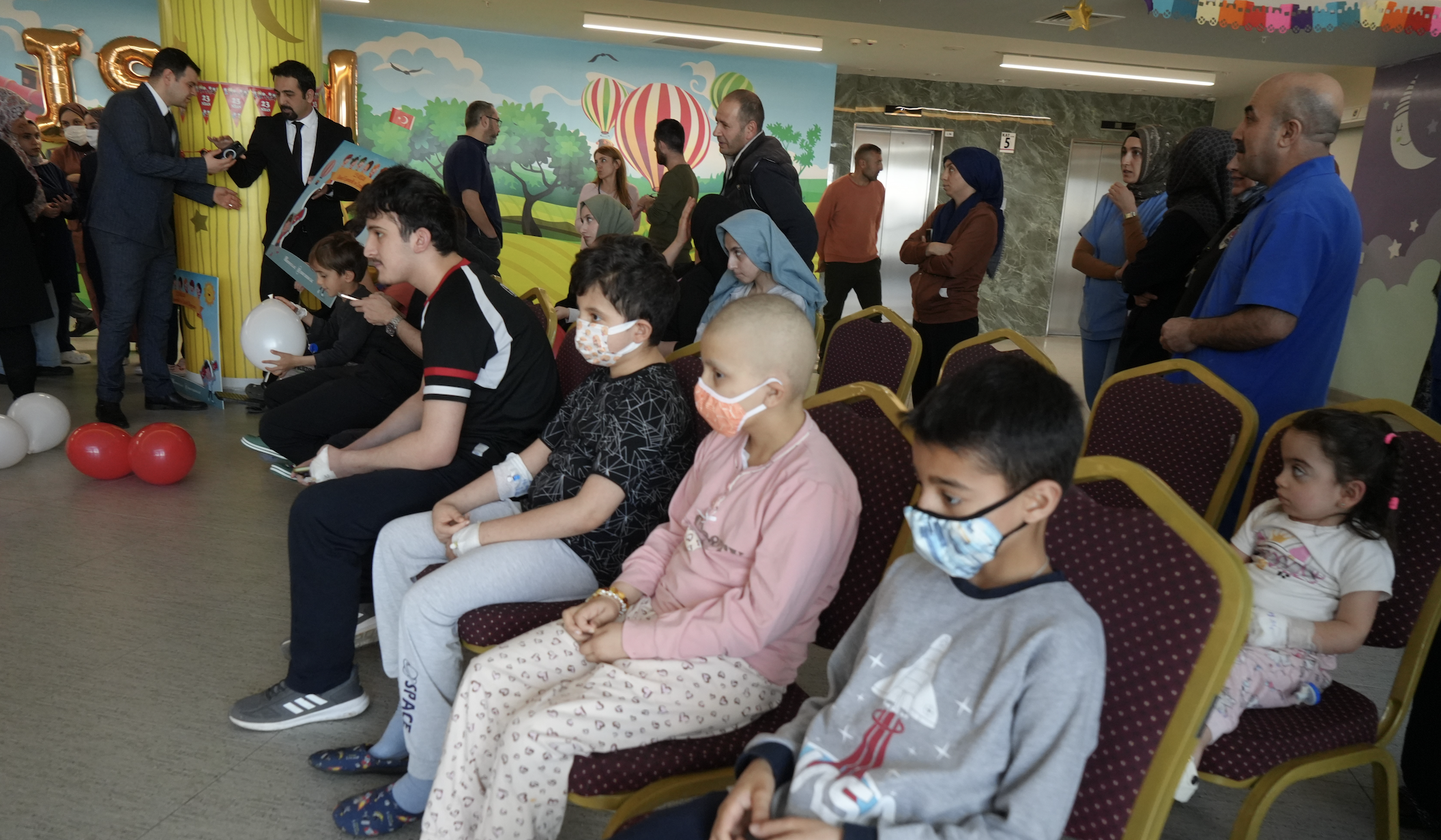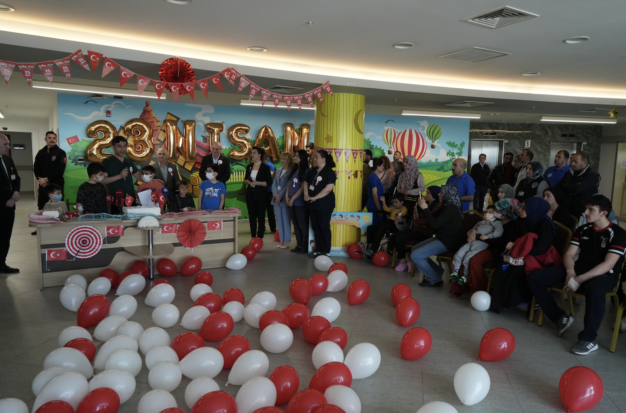 Erzurum Şehir Hastanesi Çocuk Servisi'nde tedavi olan çocuklar, 23 Nisan Ulusal Egemenlik ve Çocuk Bayramı'nı düzenlenen renkli etkinliklerle kutladı. Hastane koridorlarının balonlarla süslendiği programda, minik hastaların bayram sevinci yüzlerine yansıdı.