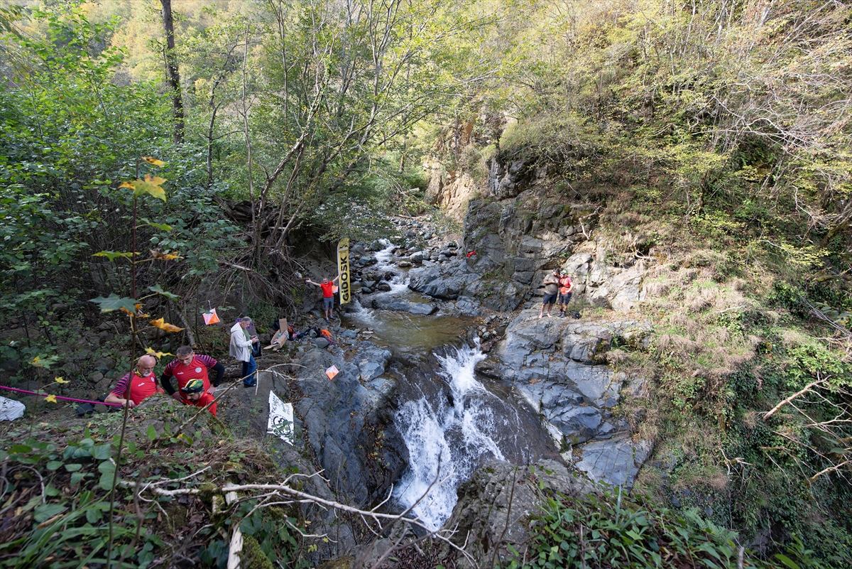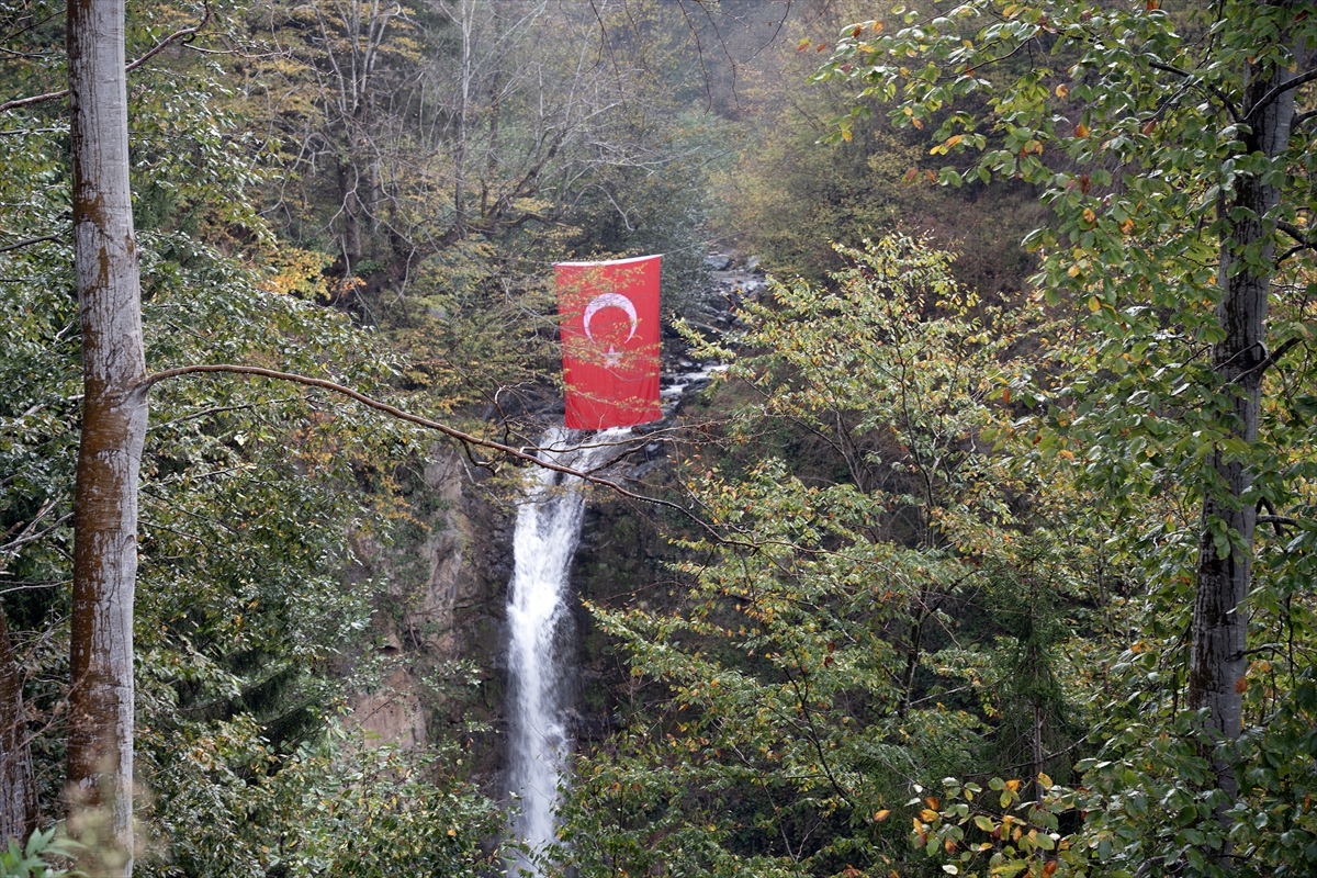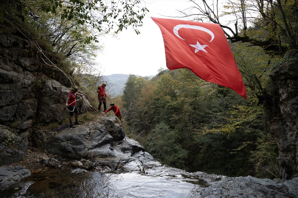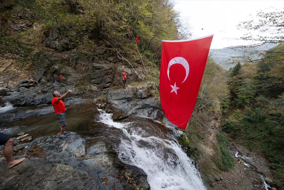 Giresun Doğa Sporları Kulübü (GİDOSK) üyeleri, Cumhuriyet Bayramı'nın 102. yıl dönümü dolayısıyla şelaleye Türk bayrakları asarak kutladılar.