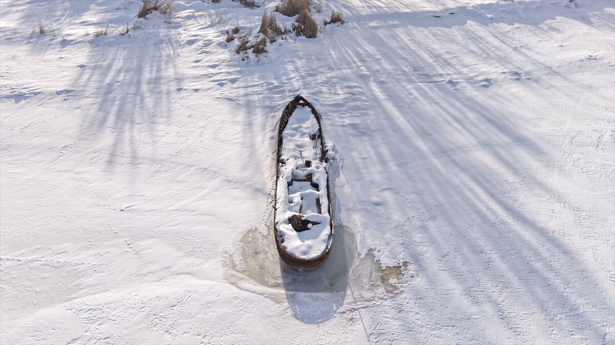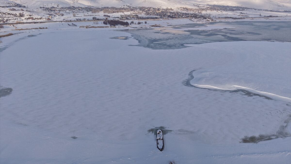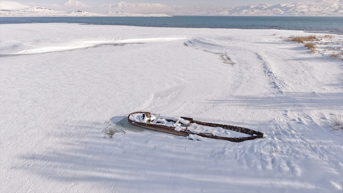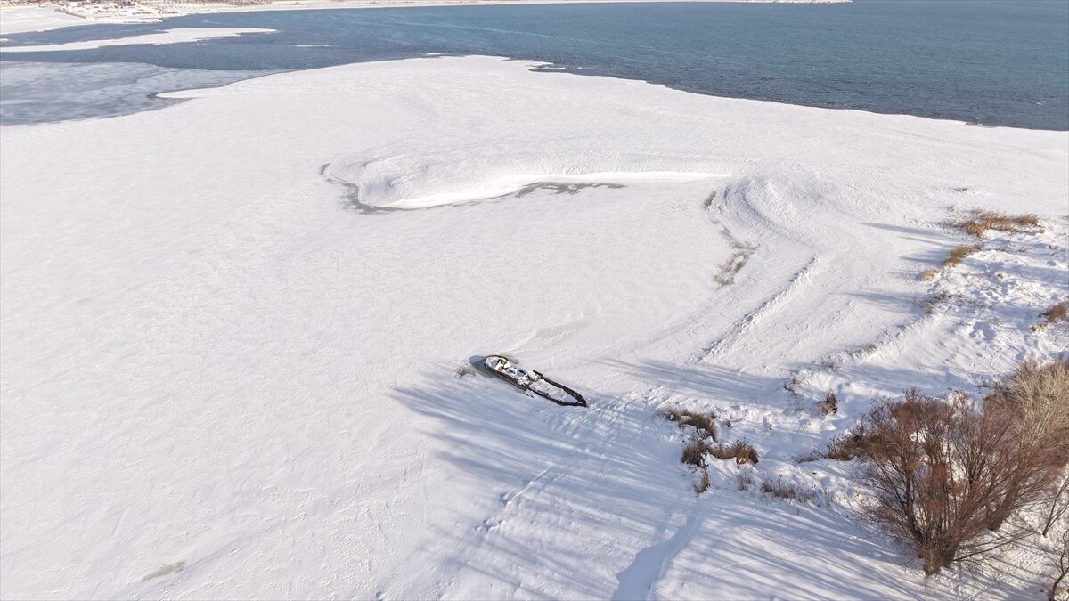 Muradiye ilçesine bağlı Ünseli Mahallesi sahilinde kıyıdaki bir tekne, kar örtüsü ve buz tabakası arasında kaldı. Tekne ve Van Gölü kıyıları dronla görüntülendi.