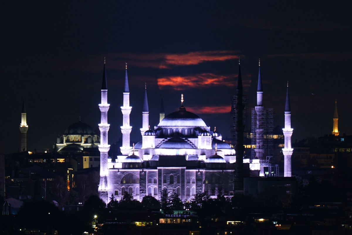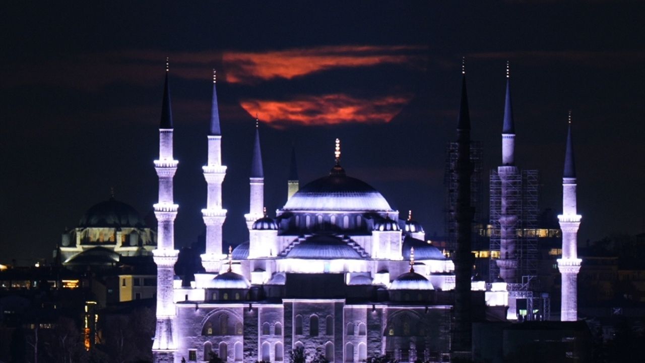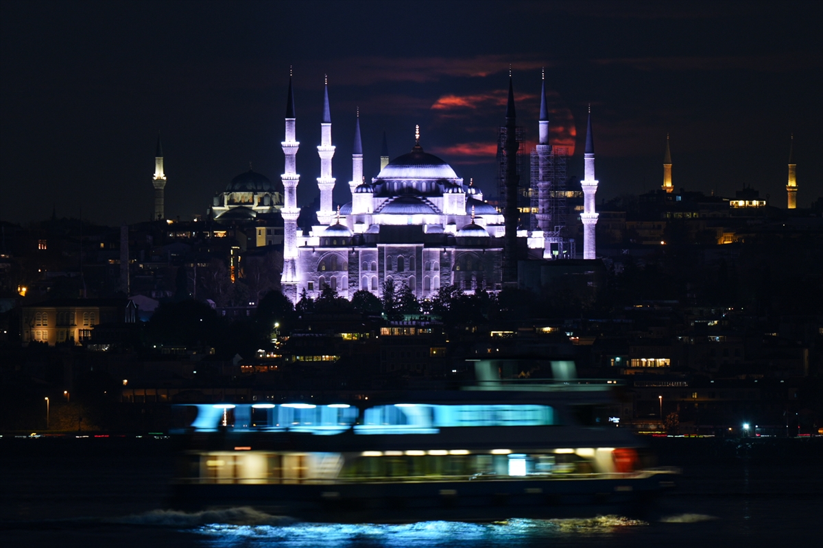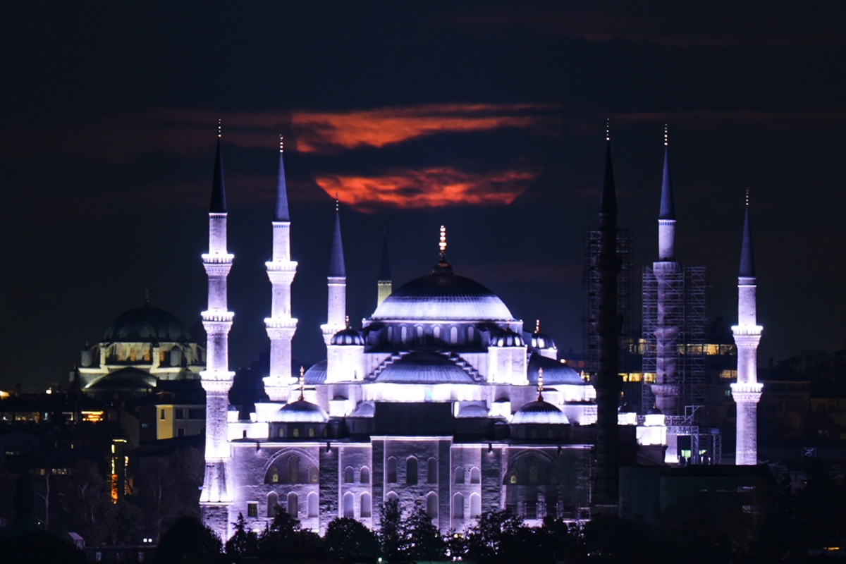 Günün ilk ışıklarıyla birlikte belirginleşen dolunay, özellikle Sultanahmet Camisi’nin kubbeleri ve minareleriyle yan yana yükselerek etkileyici bir siluet ortaya çıkardı.